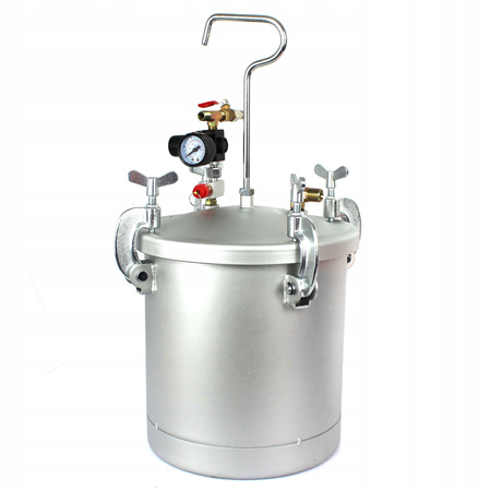 Profesjonalny agregat do malowania ciśnieniowego i klejenia. Gładki stalowy pojemnik ciśnieniowy o wysokiej odporności na korozję dzięki pokryciu zbiornika powłoką metaliczną nieelektrolityczną "Dacromet". Do uruchomienia agregatu potrzebne jest sprzężone powietrze podłączone do reduktora.