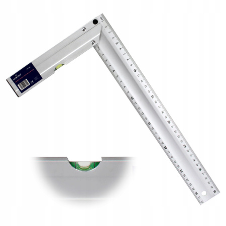 Kątownik z aluminium i wbudowaną poziomicą pozwala na wykonywanie precyzyjnych pomiarów - wyznaczanie kąta prostego oraz trasowania podczas prac stolarskich, budowlanych i pomiarowych.
