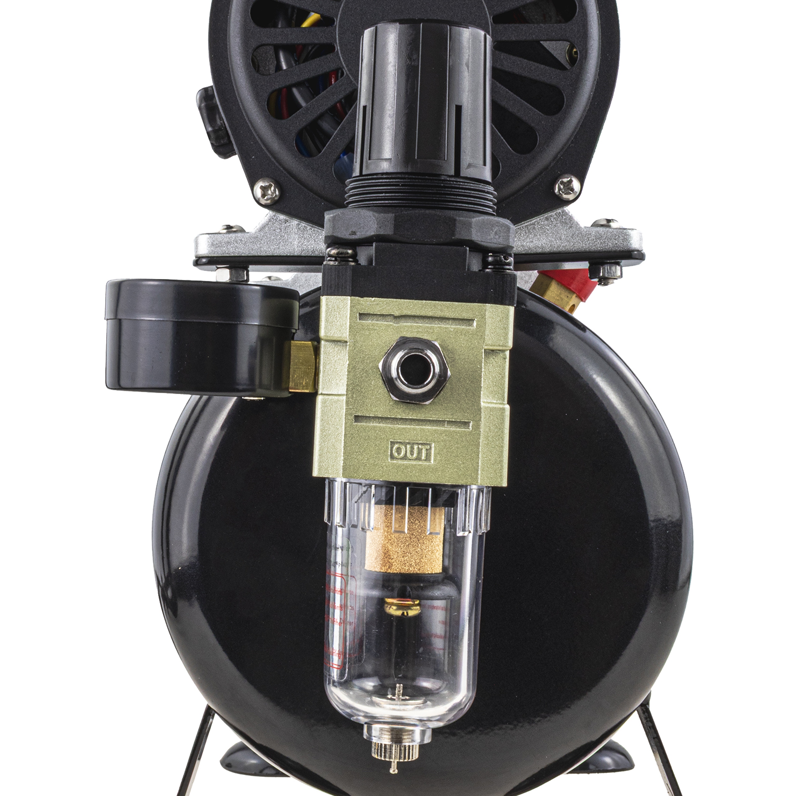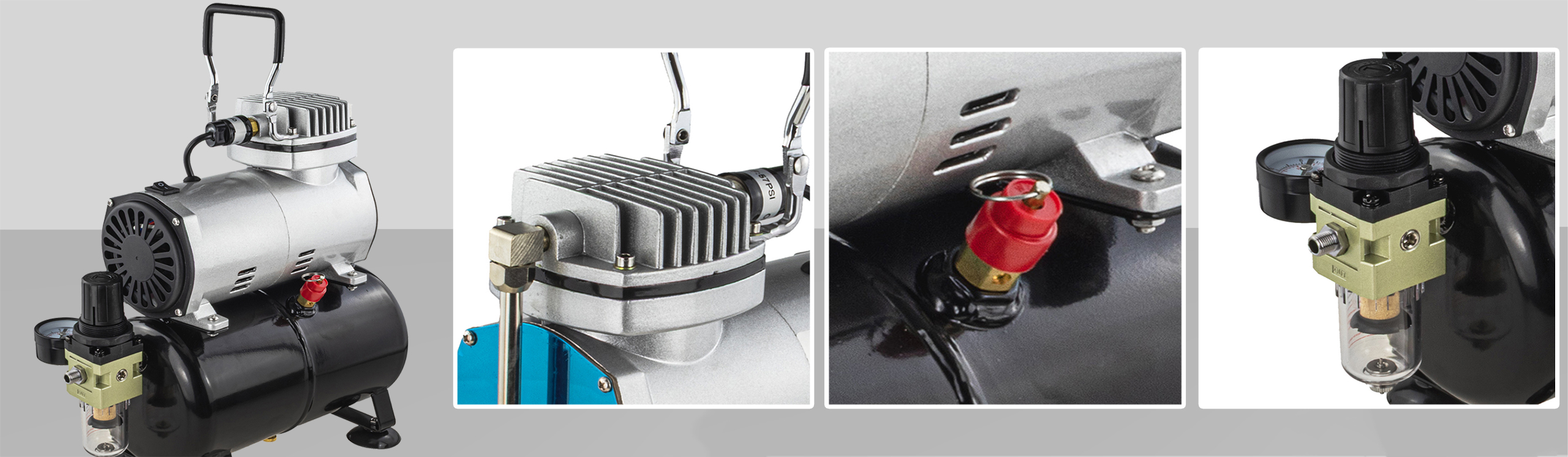 Kompresor łączy cichą pracę, niezawodność i łatwość obsługi. Dzięki reduktorowi i odwadniaczowi Twoje narzędzia będą chronione, a efekty pracy zawsze profesjonalne. Pasuje do większości dostępnych aerografów i akcesoriów na rynku.