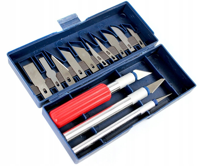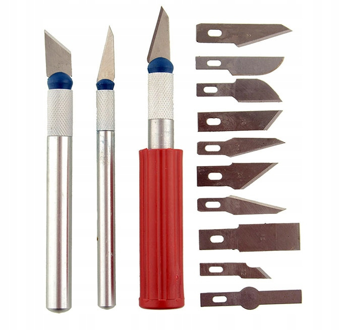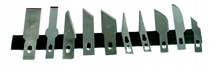 - 11 skalpeli w różnych kształtach oraz dwie płaskie końcówki - dłuta.