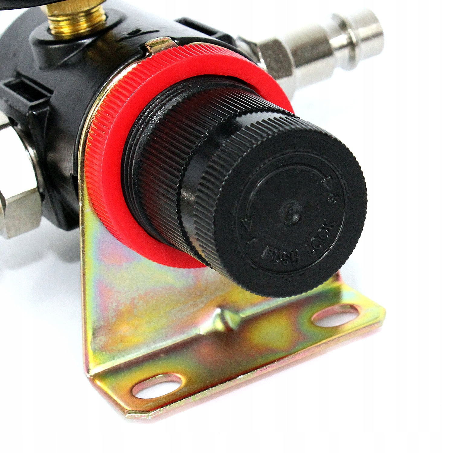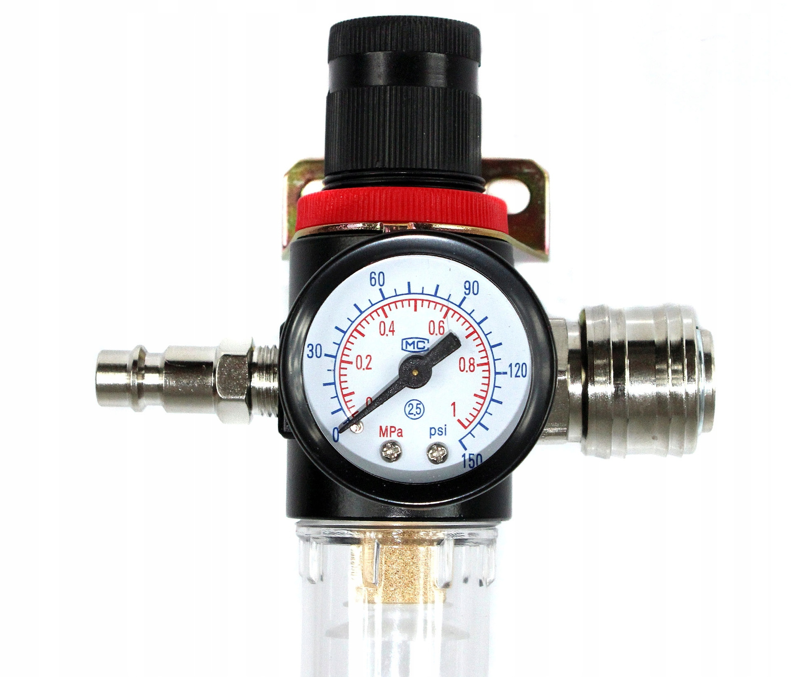 Zastosowanie zespołu filtrującego z reduktorem gwarantuje pełną kontrolę jakości powietrza w układzie zewnętrznym kompresora. Odwadniacz z separatorem wody oczyszcza sprężone powietrze ze skroplin wody powodujących zacieki podczas malowania czy też korozję narzędzi pneumatycznych. Reduktor z manometrem reguluje skoki ciśnienia pojawiające się podczas pracy kompresora.