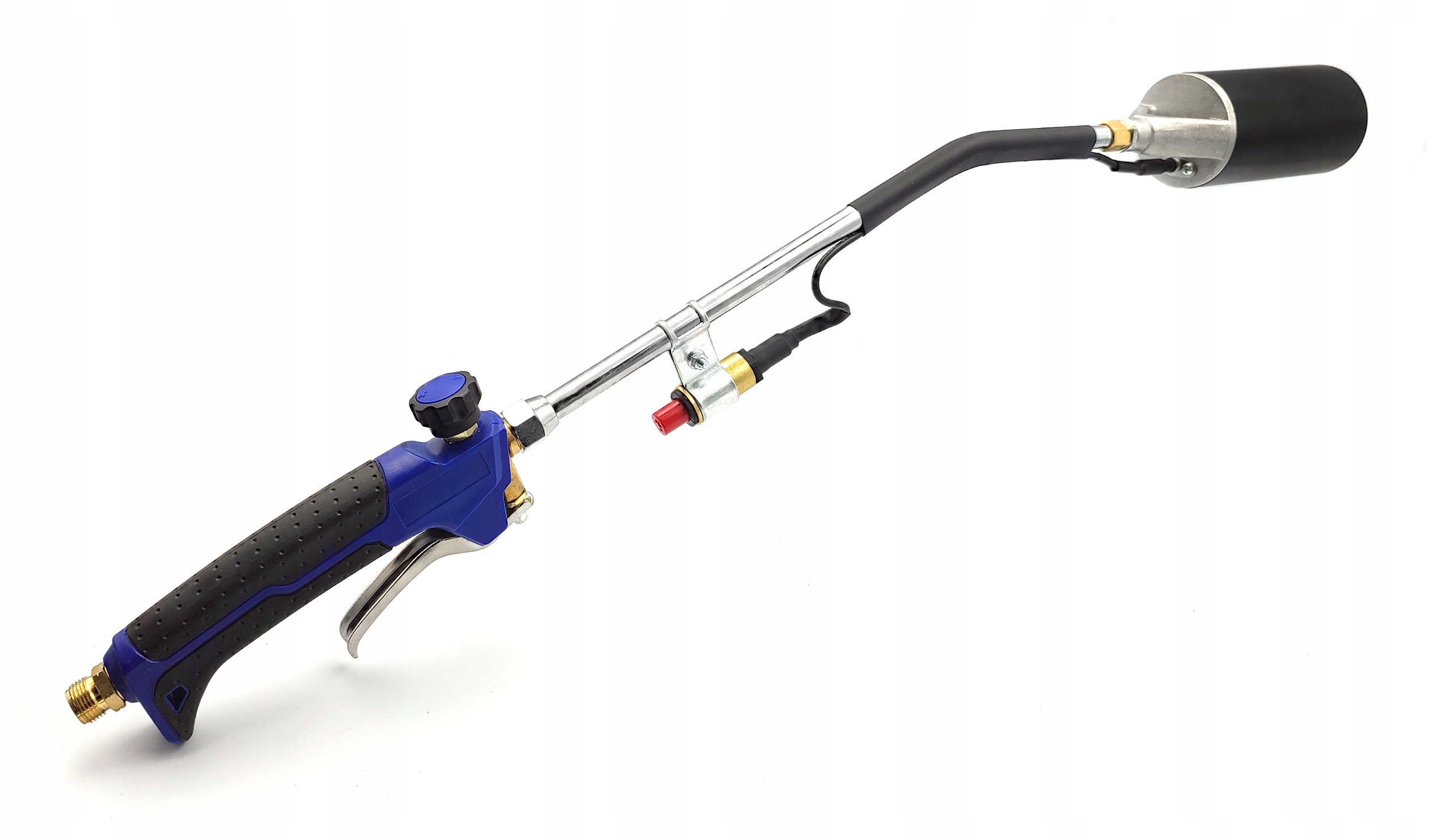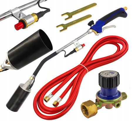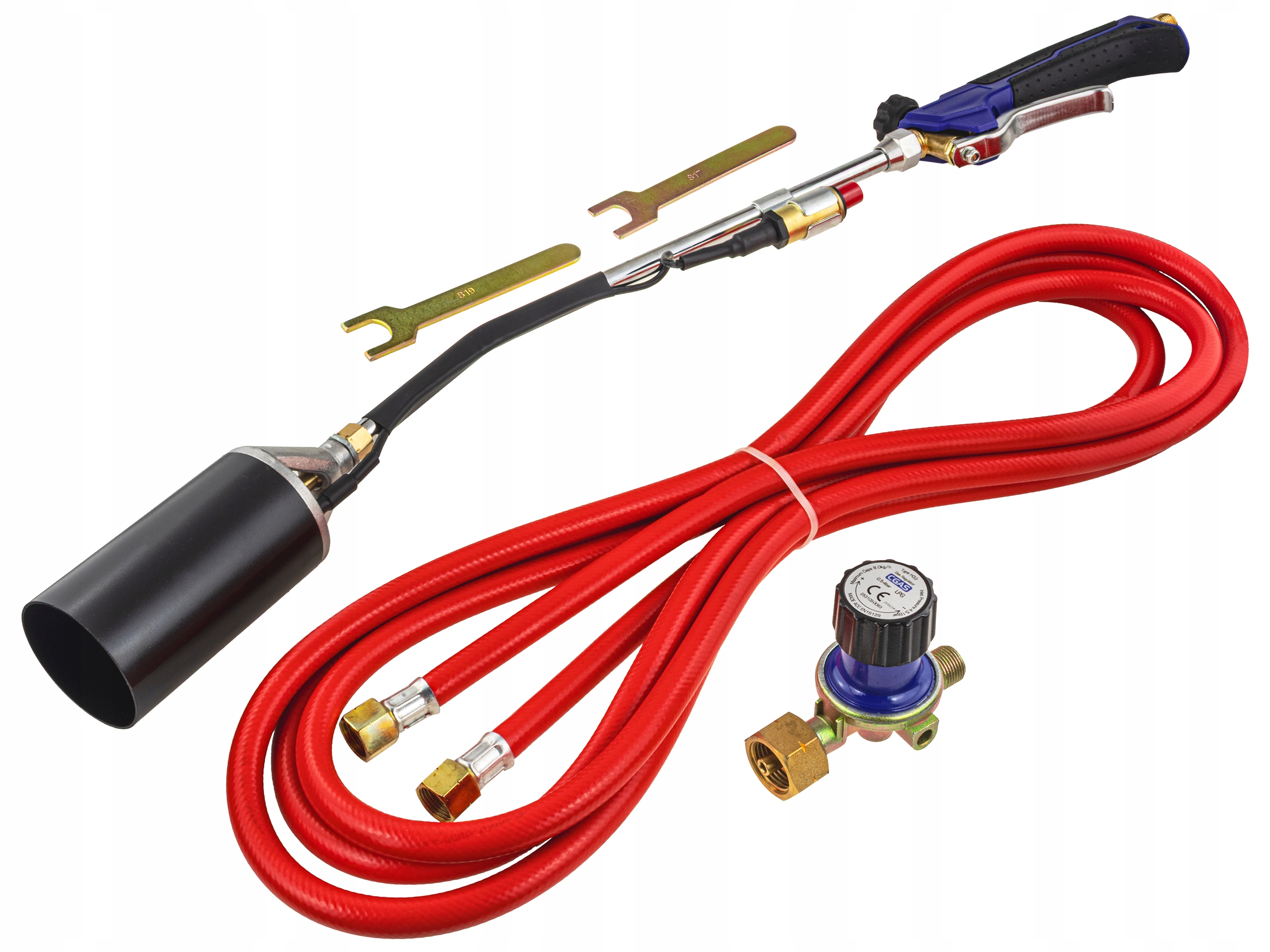 W zestawie znajduje się reduktor, elastyczny wąż o długości 5 metrów oraz zapalnik przyciskowy — palnik jest w pełni zmontowany i gotowy do pracy.