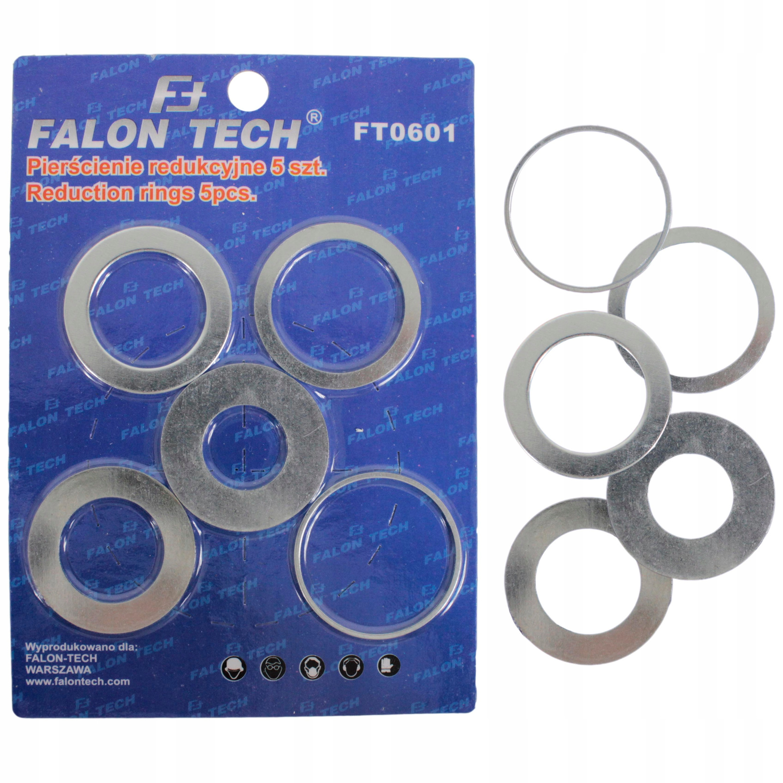 Zestaw pierścieni redukcyjnych przeznaczonych do redukcji otworów montażowych pił tarczowych.