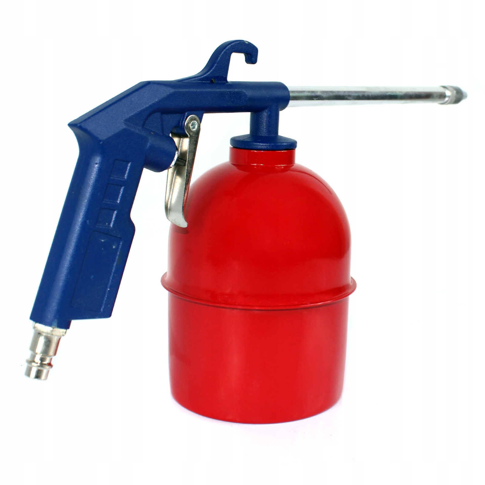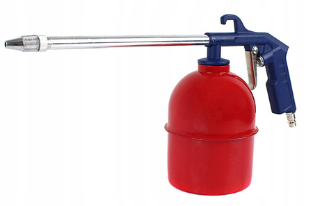 Pistolet przeznaczony do czyszczenia i ropowania silnika, maszyn, podwozia samochodu itp. Wyposażony w metalowy zbiornik o pojemności 950 ml oraz długą dyszę pozwalającą na czyszczenie trudno dostępnych miejsc.