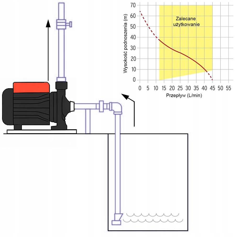 Na wykresie przedstawiono zależność pomiędzy wydajnością przepływu (w litrach na minutę) a maksymalną wysokością podnoszenia wody (w metrach).