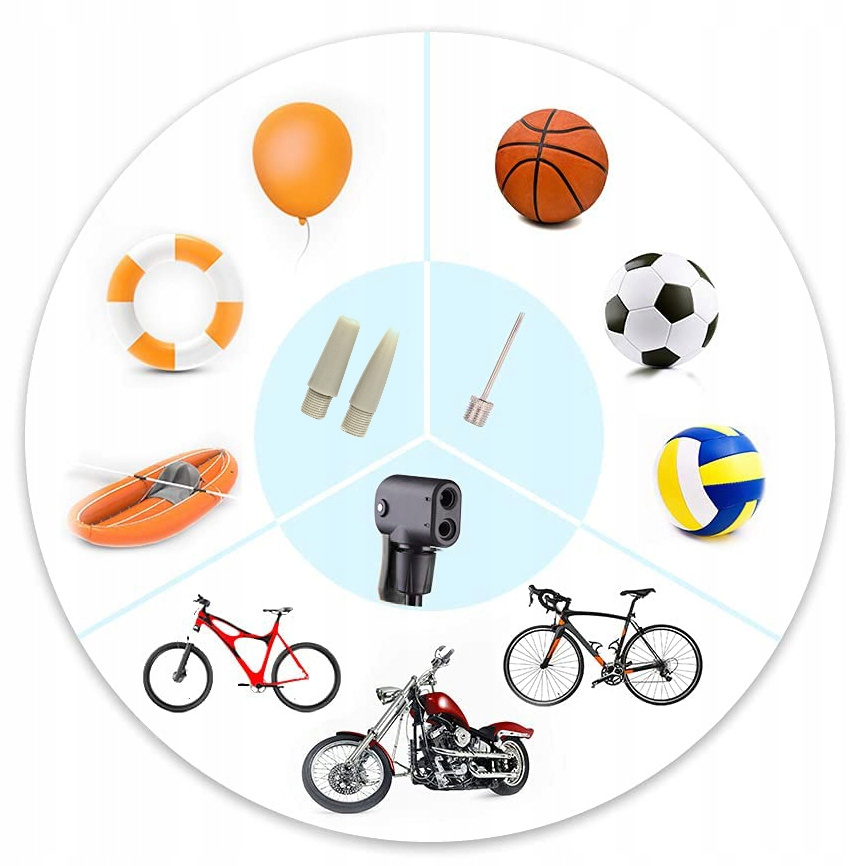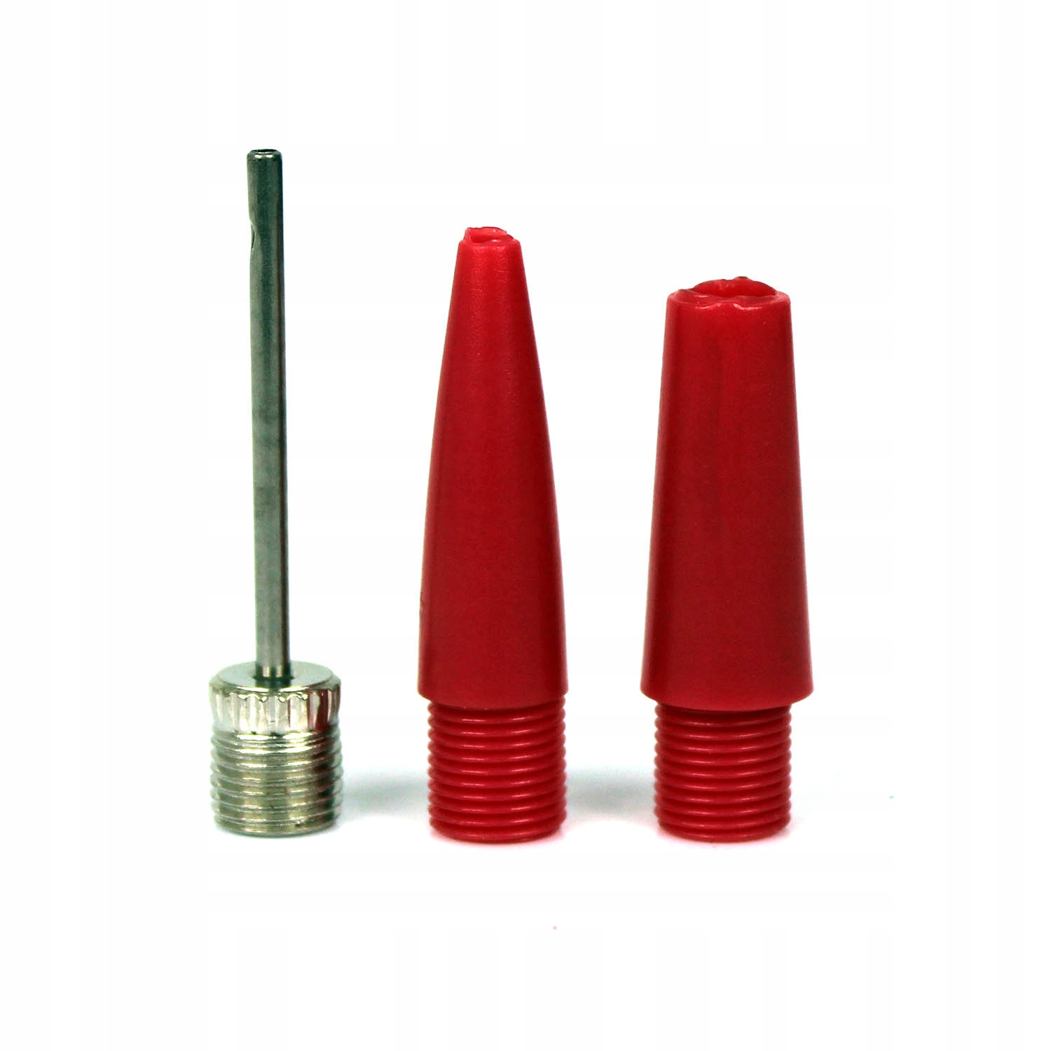 Posiada podwójną uniwersalną głowicę do wentyli samochodowych i rowerowych. Dodatkowo w zestawie adaptery i igła do pompowania materacy, piłek, dmuchanych zabawek itp.