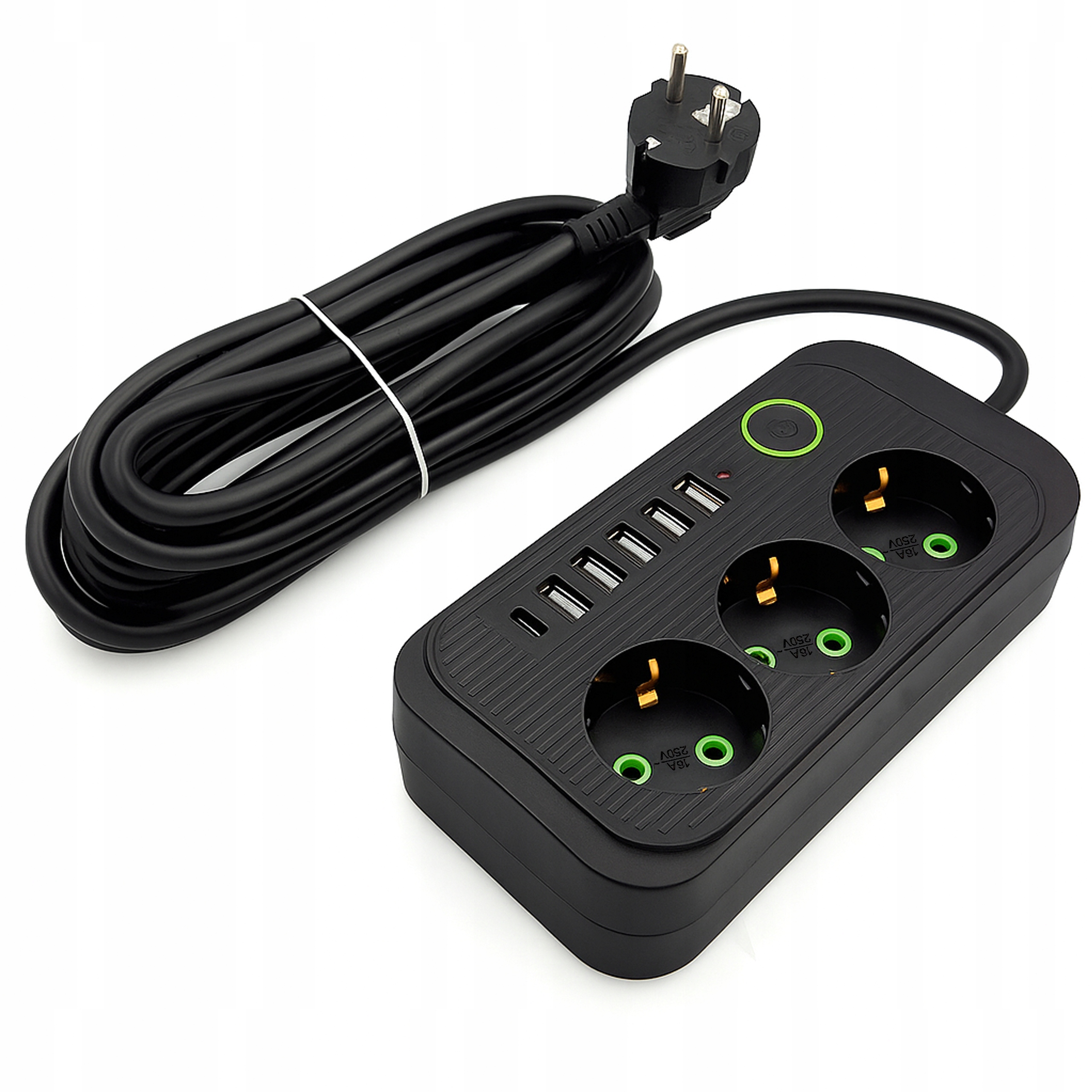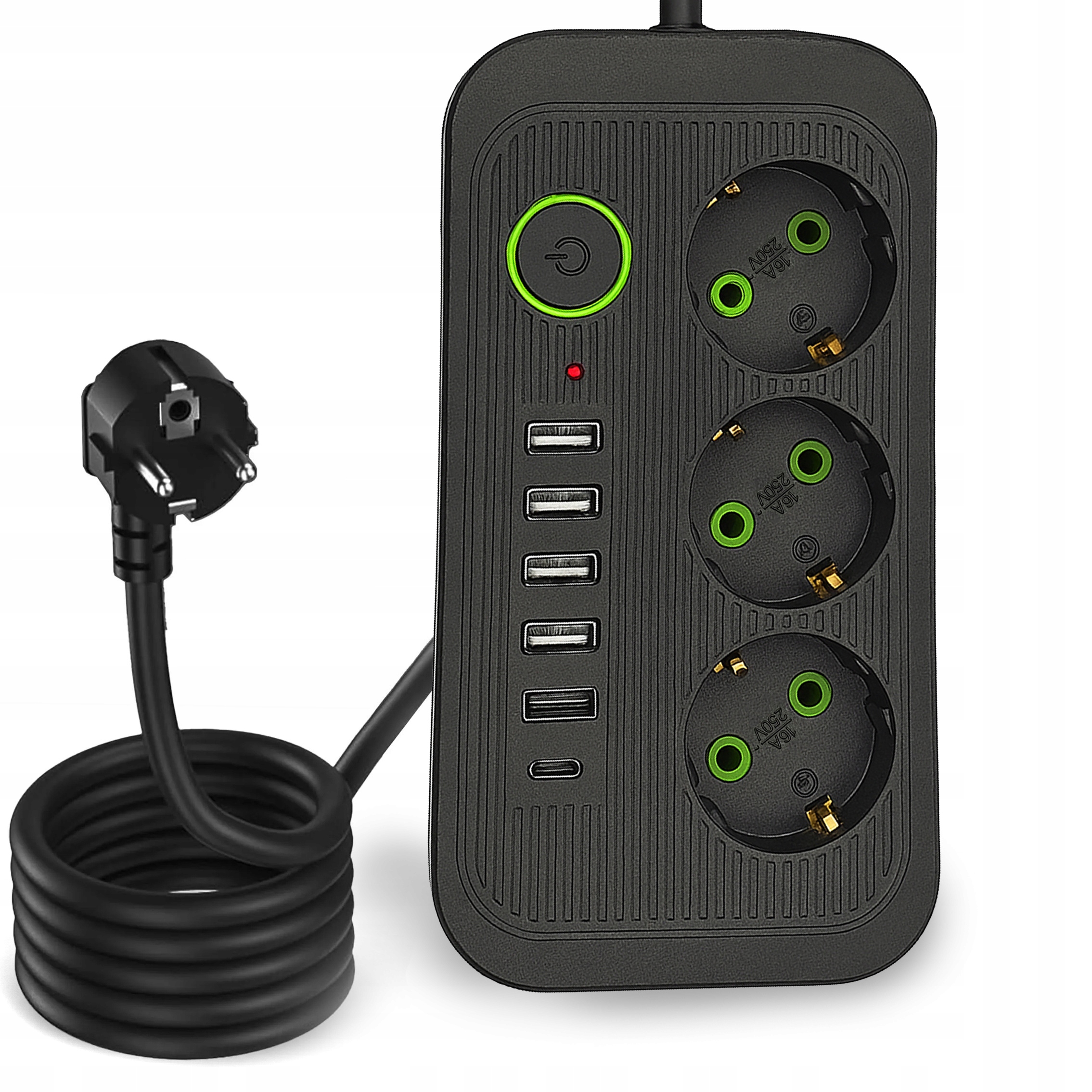 Funkcjonalny i solidny przedłużacz sieciowy w kolorze czarnym, stworzony z myślą o bezpieczeństwie i komforcie użytkowania. Umożliwia zasilanie wielu urządzeń jednocześnie, a dzięki portom USB i USB-C doskonale sprawdza się w domu, biurze i warsztacie.