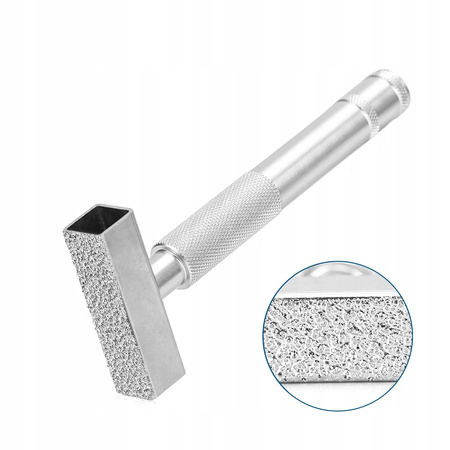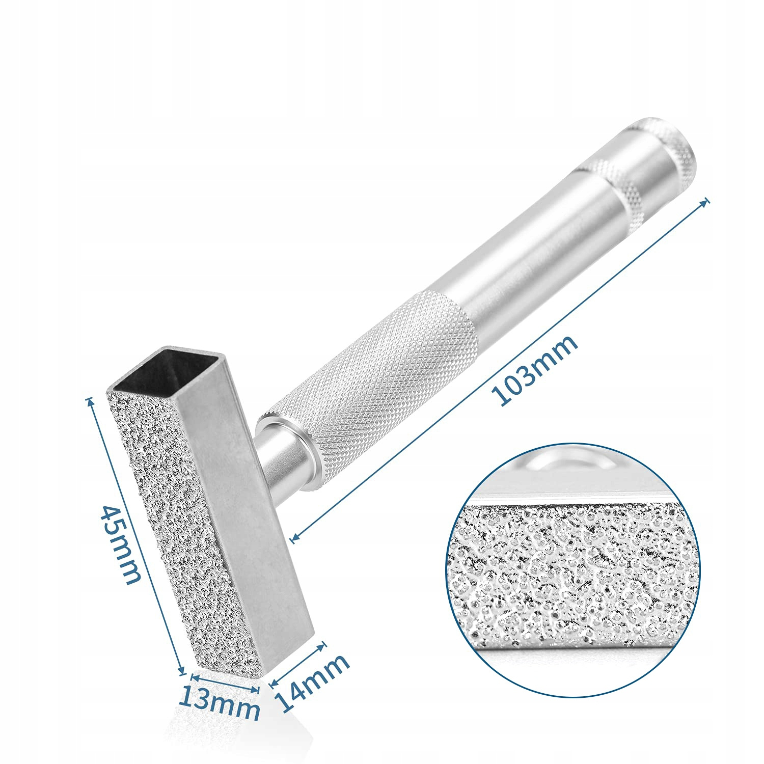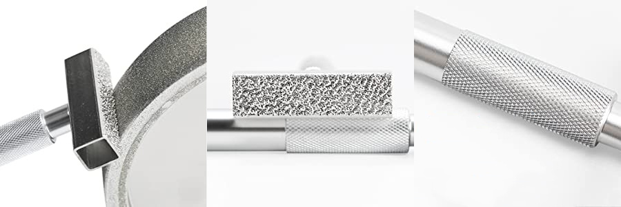 Przyrząd diamentowy do wyrównywania i oczyszczania ceramicznych tarcz ściernych. Powierzchnia ścierna, zawierająca ziarna syntetycznego diamentu ma powierzchnię 45,5 x 13 mm. Długość całkowita 11cm. Korpus i uchwyt przyrządu wykonane są z metalu, uchwyt wkręcany i moletowany.