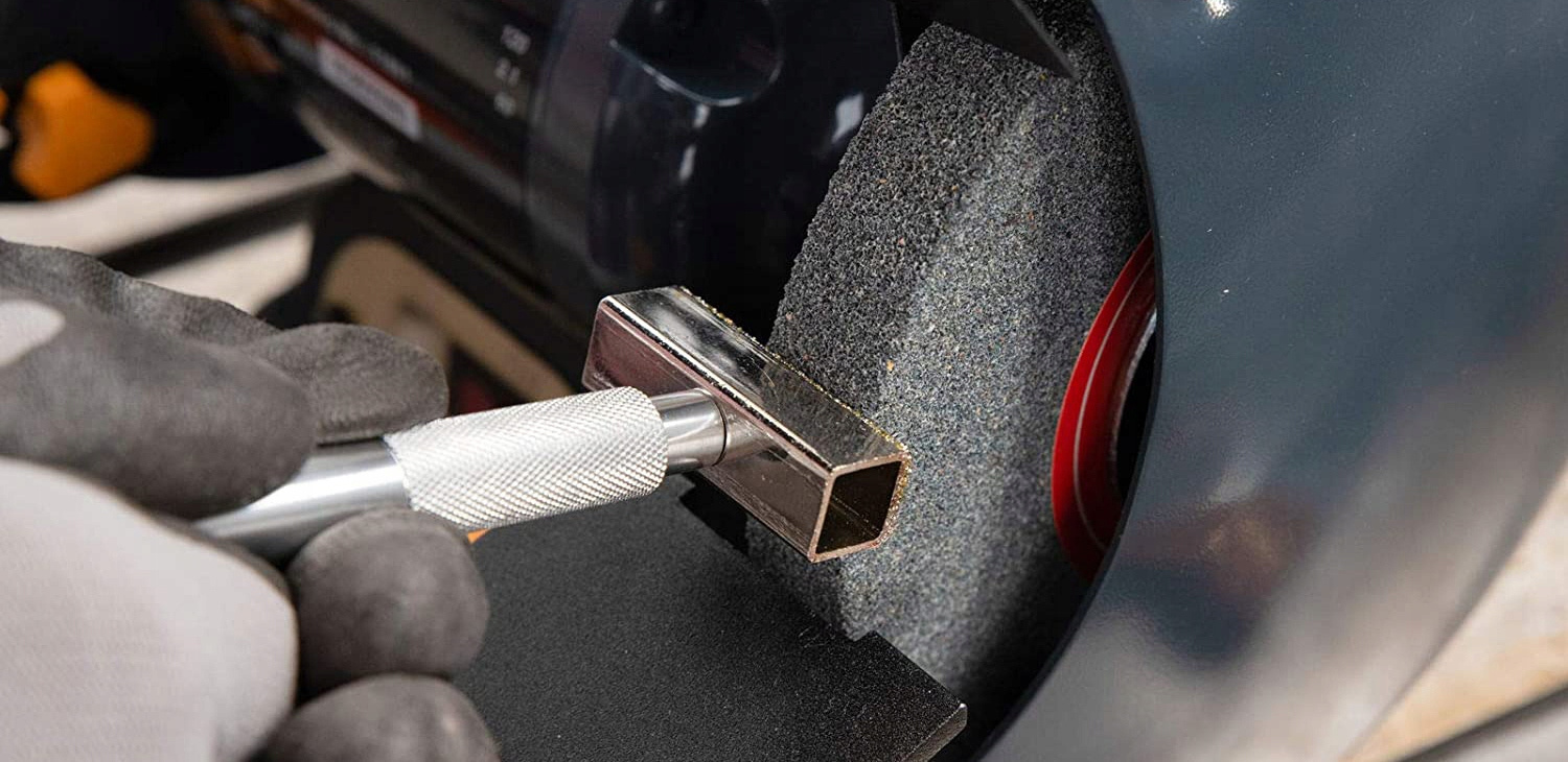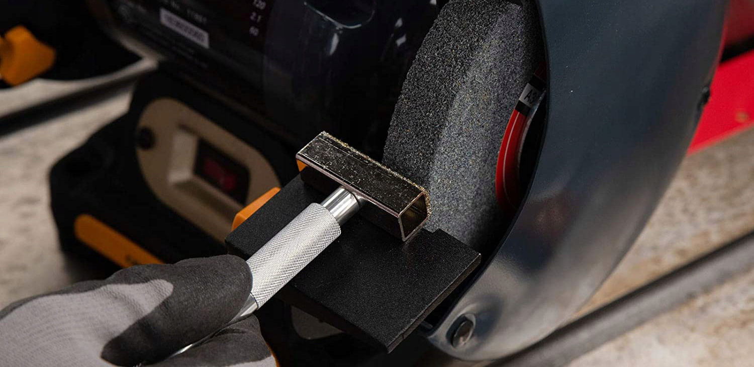 Po włączeniu szlifierki opieramy narzędzie na wsporniku, równolegle do powierzchni roboczej wyrównywanej tarczy. Następnie lekko dociskając diamentową głowicę do wirującej tarczy ścieramy tarczę, wyrównując do oczekiwanego stanu.