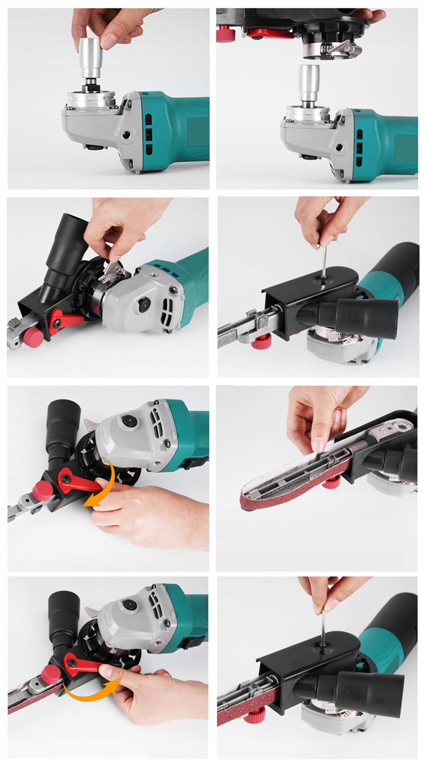 2️⃣ Zamontuj przystawkę szlifierki taśmowej