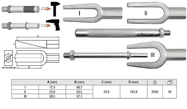 Zestaw 5-elementowy, zawiera 3 widelce o szerokości 17,4 mm; 23,8 mm i 28,5 mm oraz rękojeść do pobijania młotkiem ręcznym i rękojeść do młotka pneumatycznego.