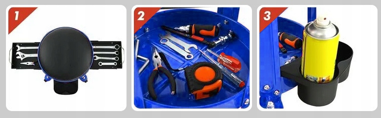 ✅ Tacka na klucze i akcesoria, umieszczona na dole taboretu, pozwala na szybkie odłożenie niezbędnych podczas pracy narzędzi.