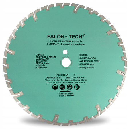 Tarcza diamentowa Falon-Tech fi 350 mm do granitu i materiałów twardych. Profesjonalna tarcza diamentowa do cięcia spawana laserowo. Przeznaczona do pracy w szlifierkach kątowych na sucho.