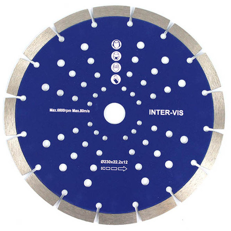 Tarcza diamentowa INTER-VIS fi 230mm do obróbki materiałów budowlanych: polbruk, beton, cegła, kostka brukowa, klinkier, gazobeton, płytki ceramiczne. Profesjonalna tarcza diamentowa do cięcia spawana laserowo. Przeznaczona do pracy w szlifierkach kątowych na sucho.