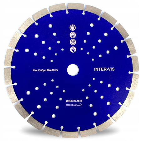 Tarcza diamentowa INTER-VIS fi 350mm do obróbki materiałów budowlanych: polbruk, beton, cegła, kostka brukowa, klinkier, gazobeton, płytki ceramiczne. Profesjonalna tarcza diamentowa do cięcia spawana laserowo. Przeznaczona do pracy w szlifierkach kątowych na sucho.