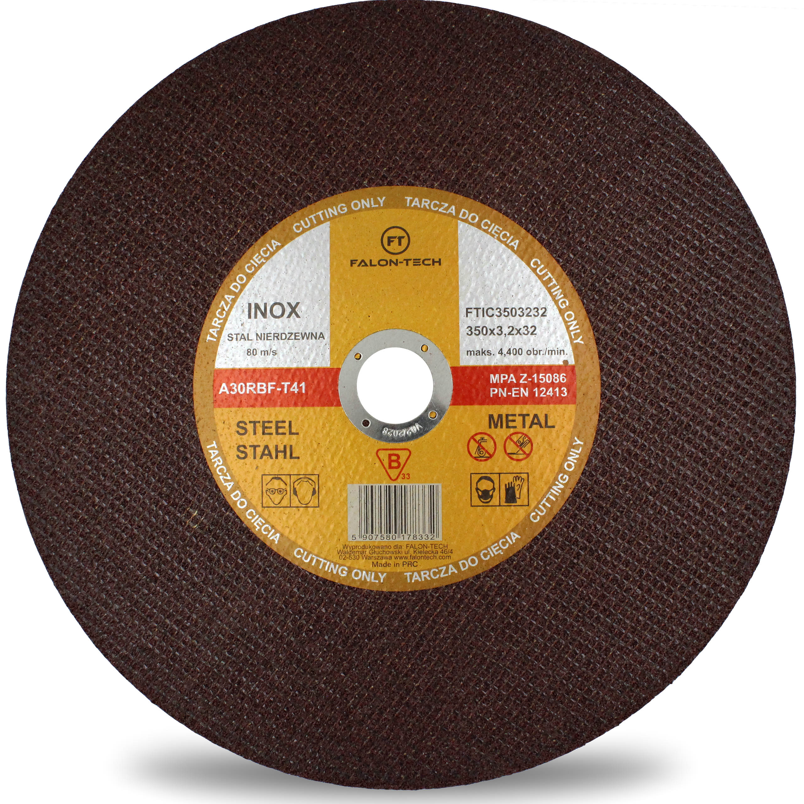 Tarcza tnąca marki Falon-Tech o wymiarach 350 x 3,2 x 32 mm została zaprojektowana z myślą o precyzyjnym i szybkim cięciu stali, metalu oraz stali nierdzewnej (INOX). Model A30RBF-T41 wykonany jest z wysokiej jakości elektrokorundu (A), a dzięki zastosowaniu żywicznego spoiwa wzmacnianego siatką z włókna szklanego, tarcza charakteryzuje się wysoką wytrzymałością i bezpieczeństwem podczas pracy.
