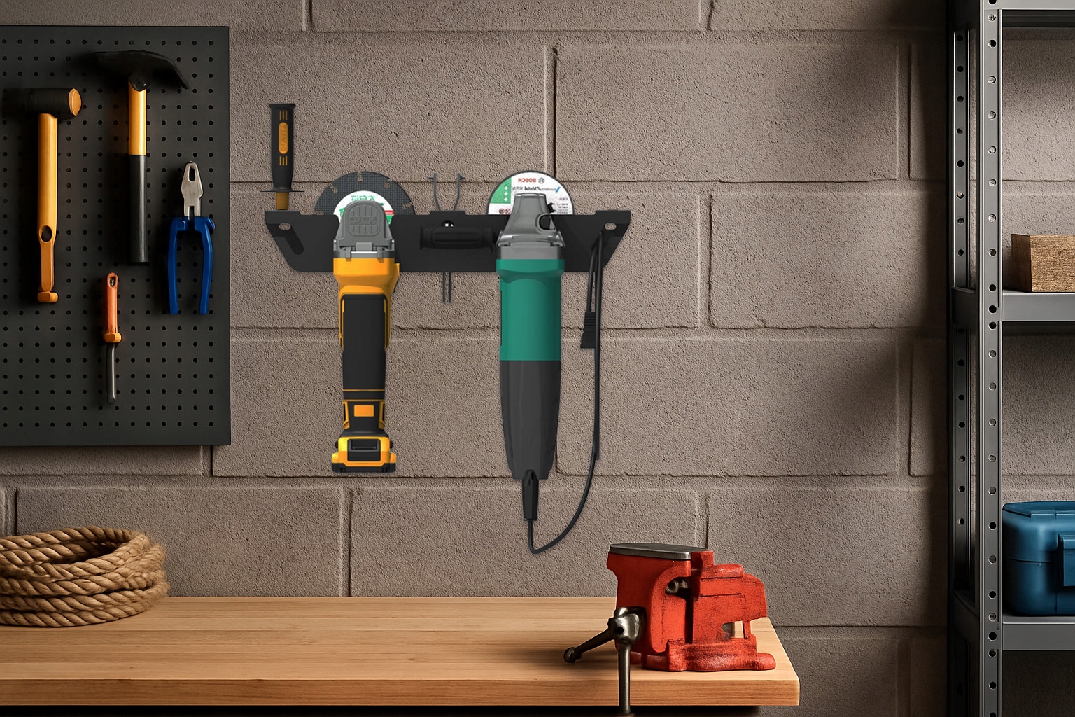 Szukasz praktycznego rozwiązania do organizacji narzędzi w warsztacie lub garażu? Nasz metalowy uchwyt ścienny został zaprojektowany z myślą o bezpiecznym i uporządkowanym przechowywaniu dwóch szlifierek kątowych typu FLEX 125 mm oraz dodatkowych akcesoriów.