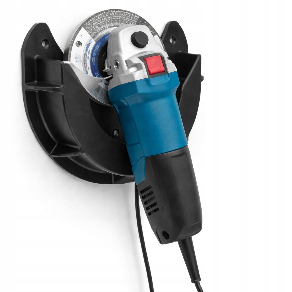 Uchwyt został zaprojektowany tak, aby szlifierka była zawieszona na tarczy, co jest sprawdzonym i stabilnym sposobem przechowywania stosowanym w profesjonalnych warsztatach. Odpowiednio wyprofilowana konstrukcja umożliwia także poprowadzenie przewodu, ograniczając jego plątanie i ryzyko uszkodzenia.