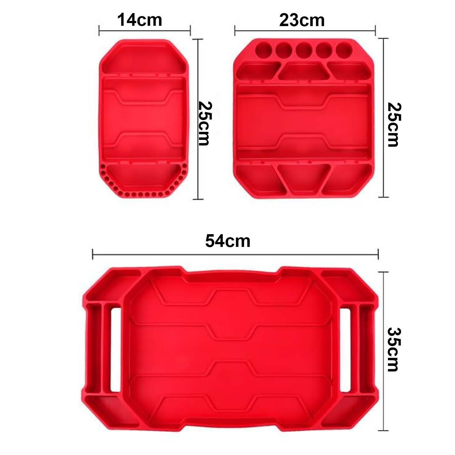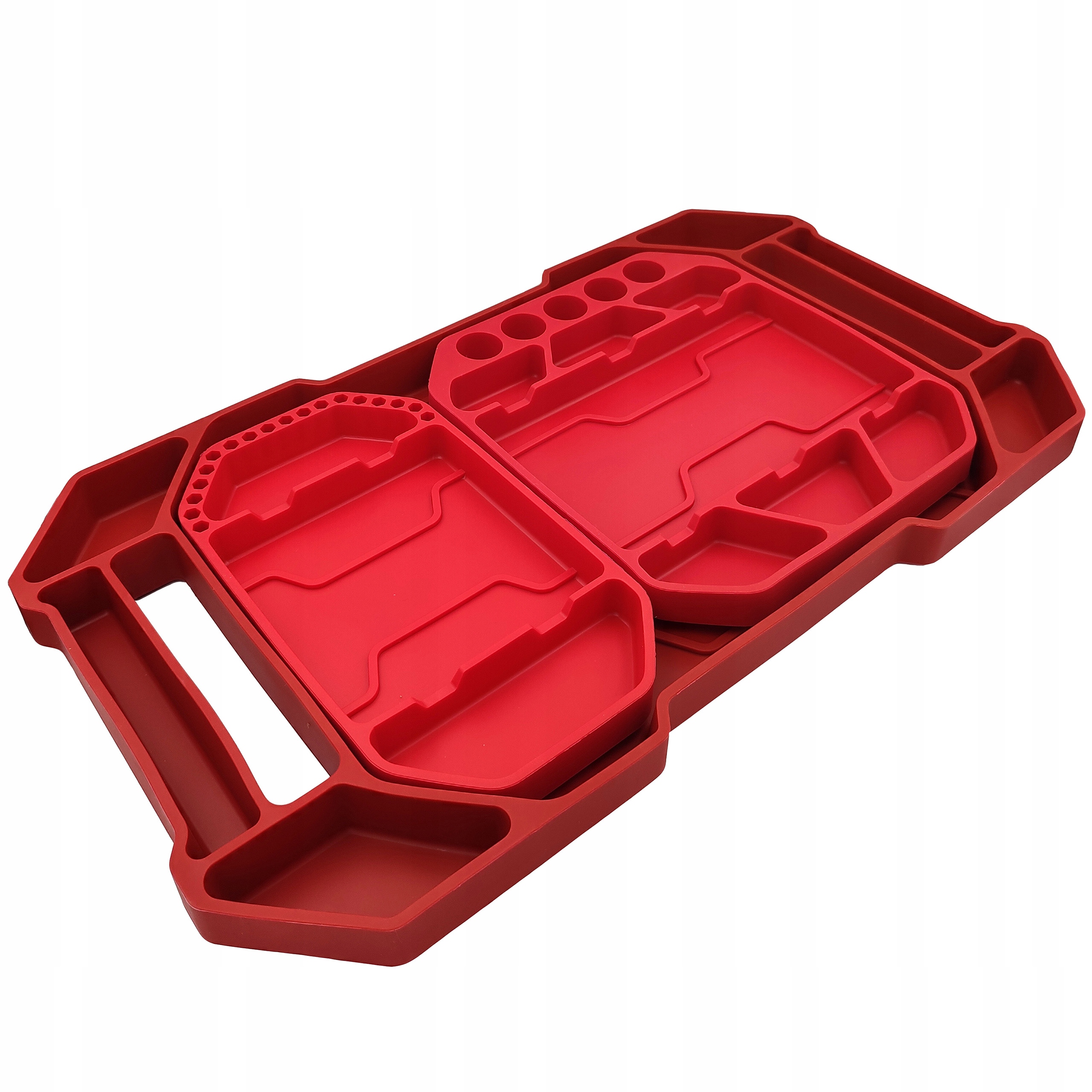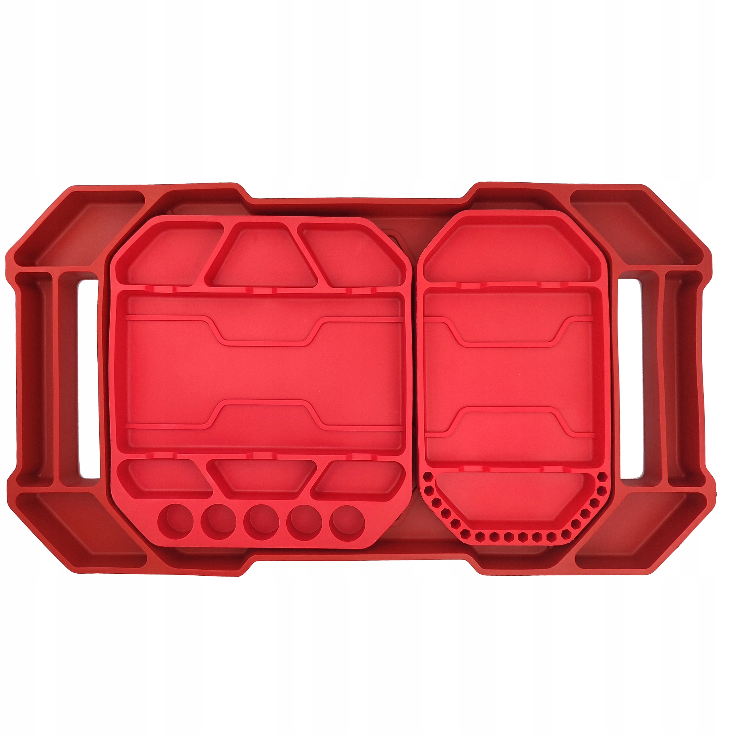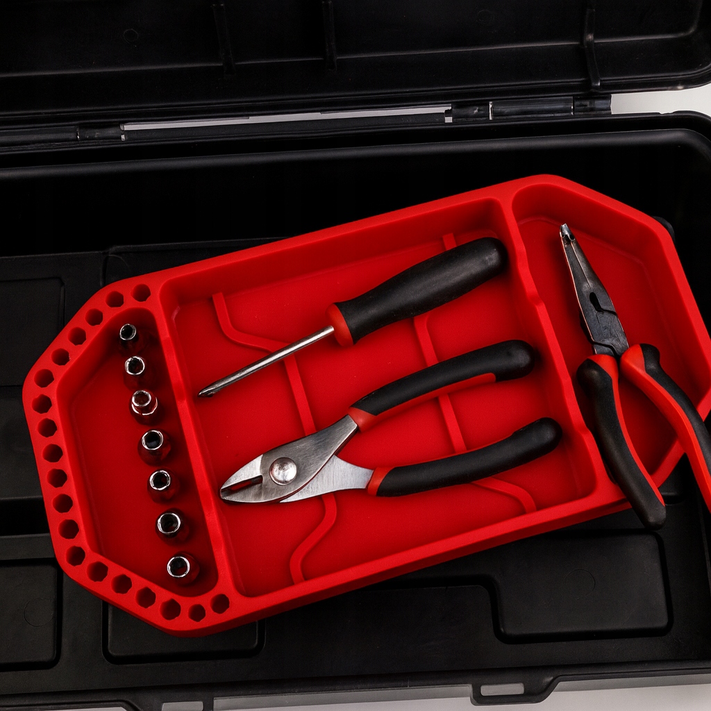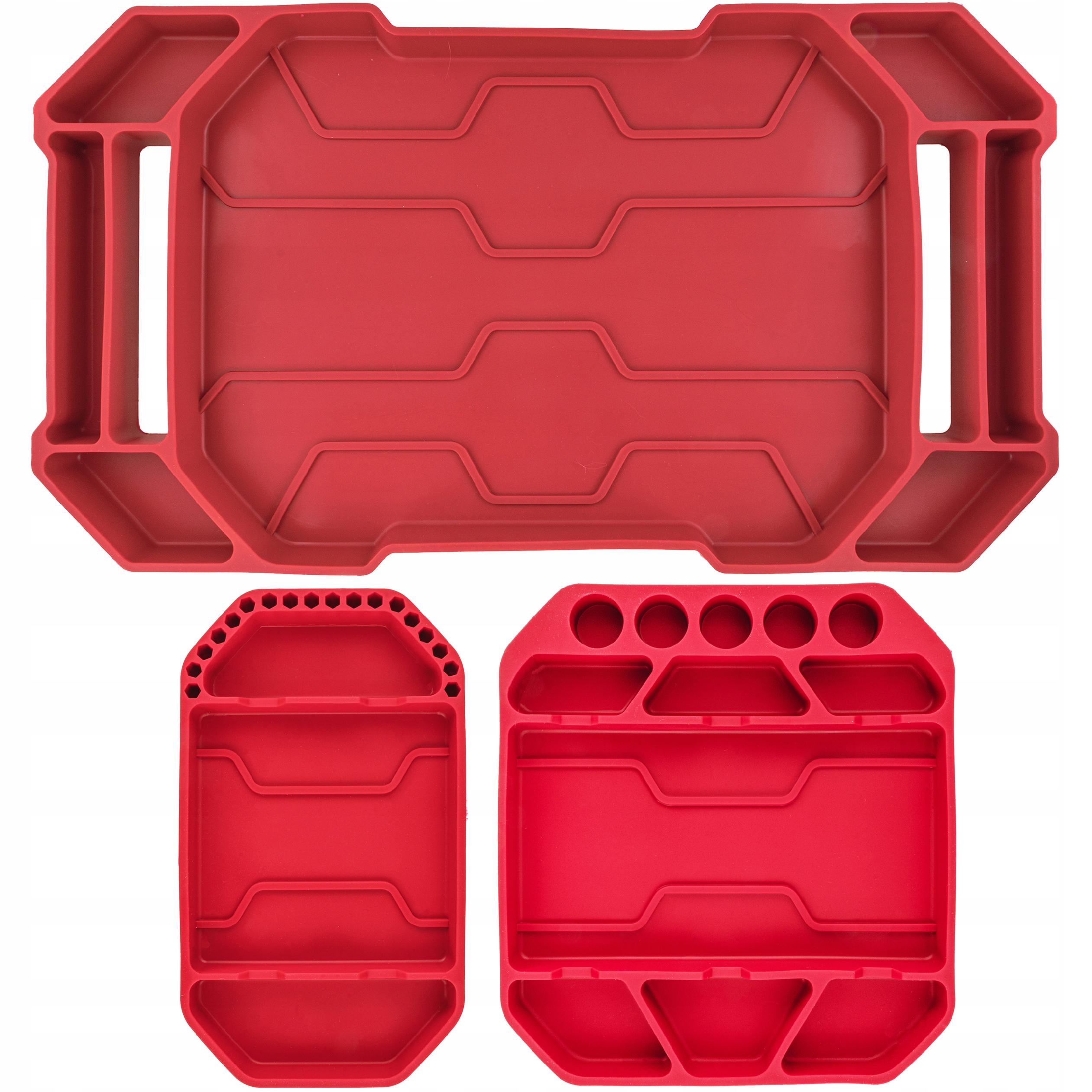Profesjonalny zestaw trzech mat silikonowych to idealne rozwiązanie dla warsztatów, serwisów i domowych garaży. Różne rozmiary i układ przegródek pozwalają uporządkować większe narzędzia, jak i drobne elementy – śruby, bity czy nasadki.