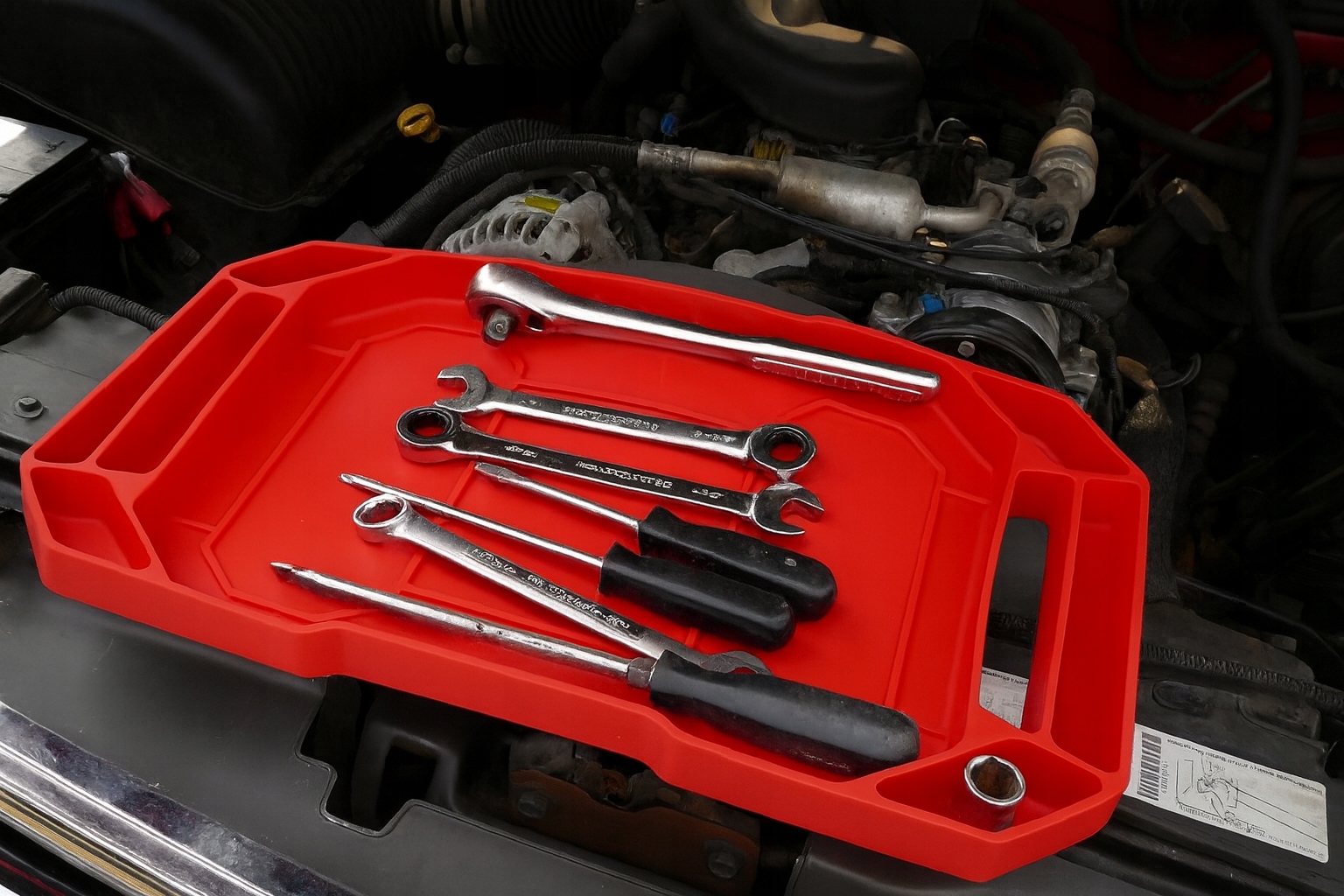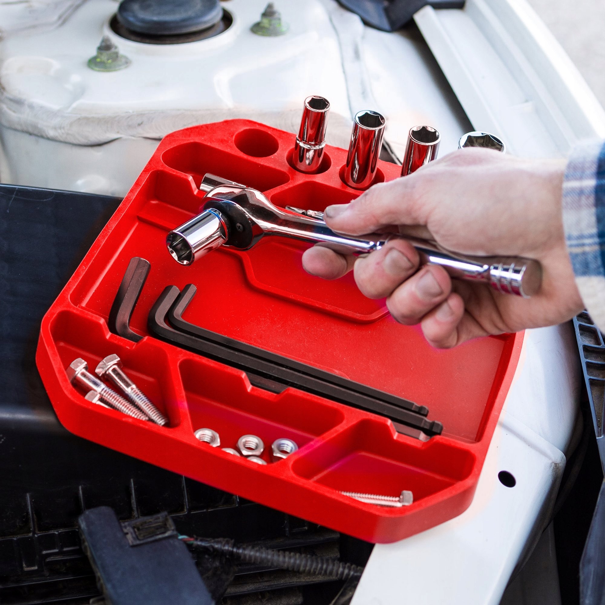 Dzięki swoim właściwościom mata warsztatowa jest niezwykle uniwersalna – można w niej przechowywać zarówno cięższe klucze i śrubokręty, jak i drobne elementy jak śrubki czy bezpieczniki.