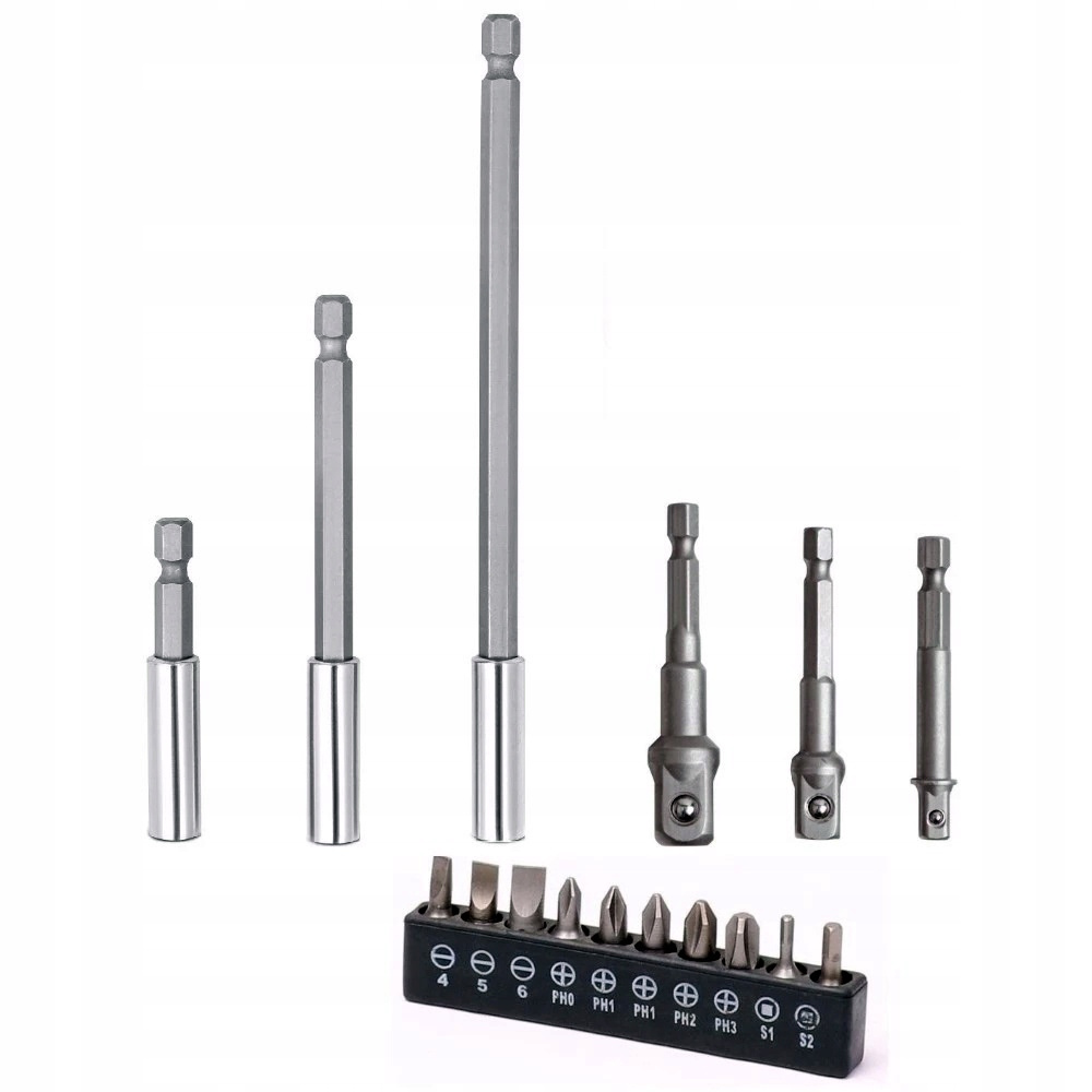 Komplet 10 szt. profesjonalnych bitów 25 mm 1/4" w zestawie z 3 przedłużkami i 3 adapterami do wkrętarki.