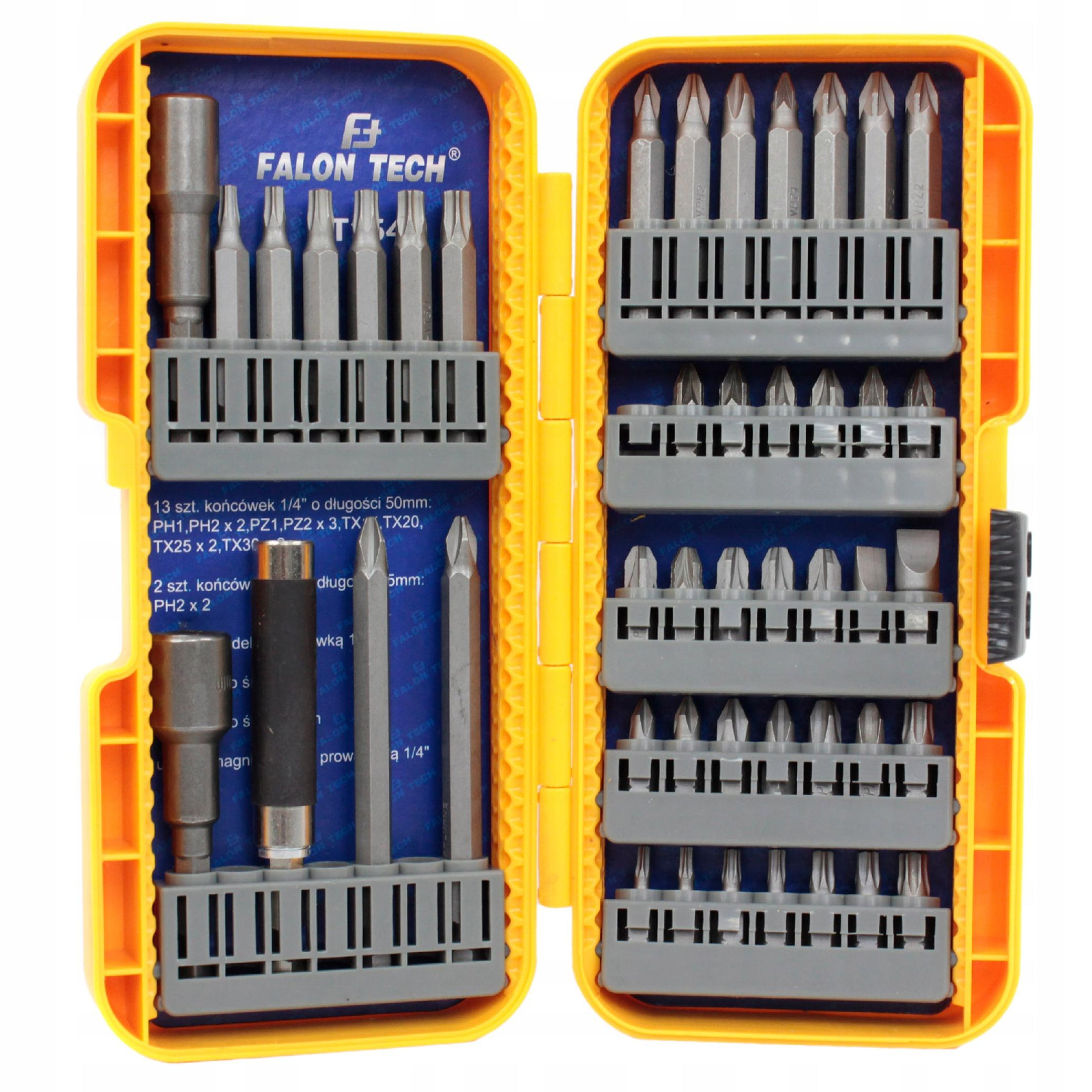 - 13 szt. bitów 50 mm: PH1, PH2x2, PZ1, PZ2x3, T15, T20, T25x2, T30x2
