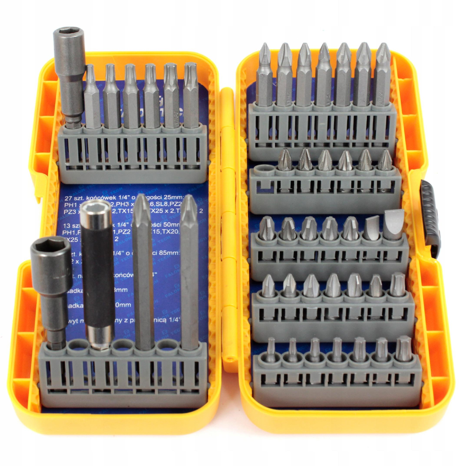 - 27 szt. bitów 25 mm: PH1x2, PH2x2, PH3x2, SL6, SL8, PZ2x6, PZ3x5, T10x2, T15x2, T25x2, T30x2