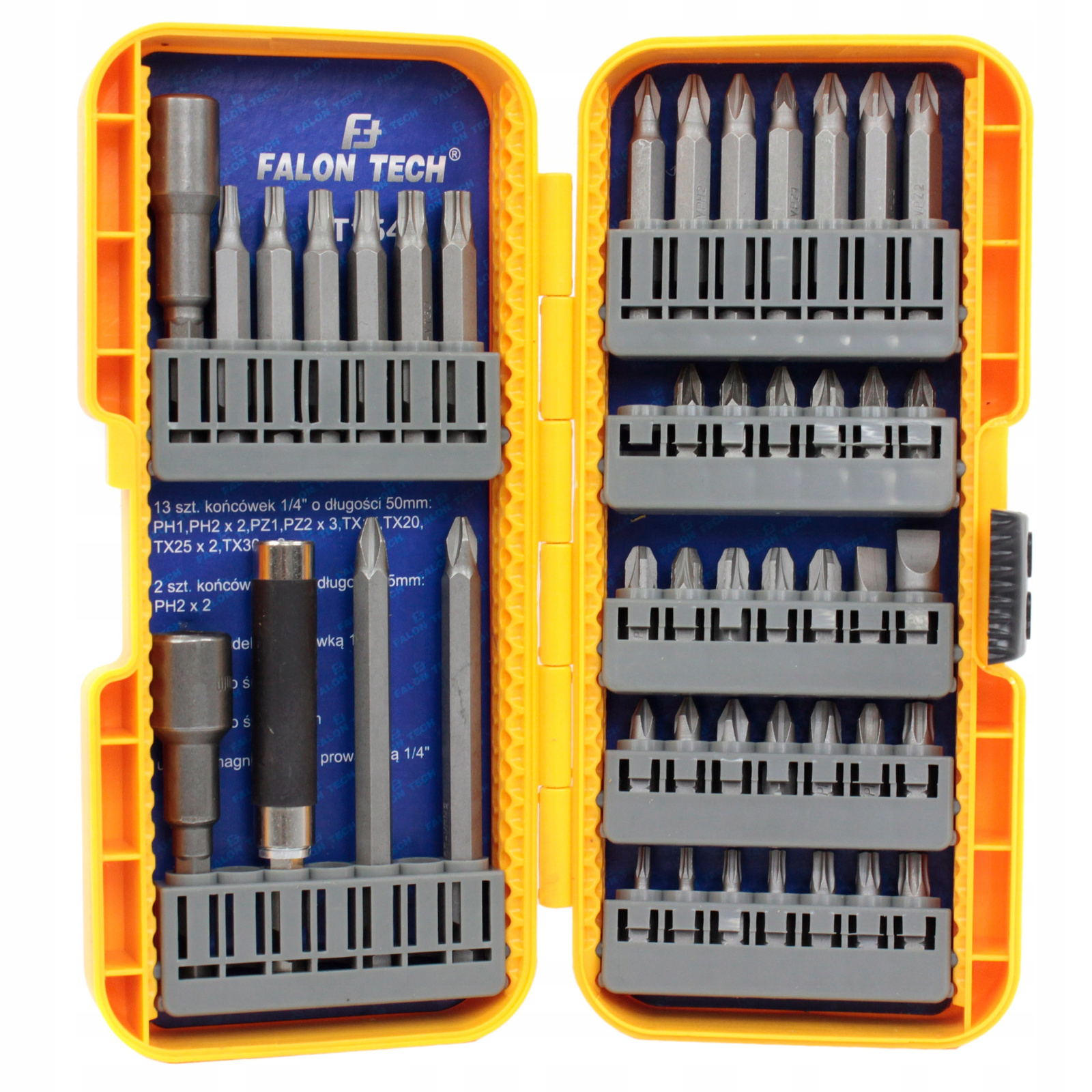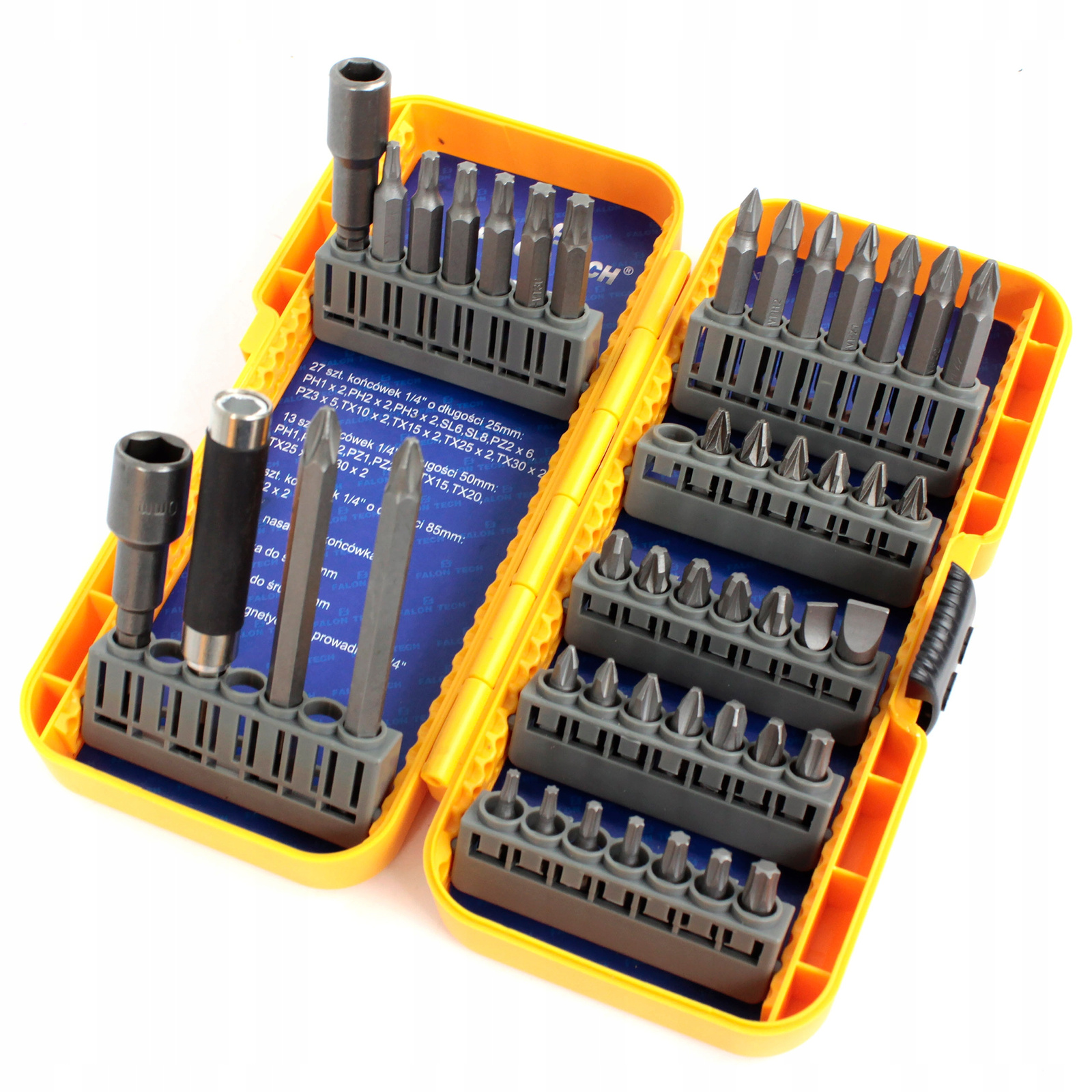 - 27 szt. bitów 25 mm: PH1x2, PH2x2, PH3x2, SL6, SL8, PZ2x6, PZ3x5, T10x2, T15x2, T25x2, T30x2