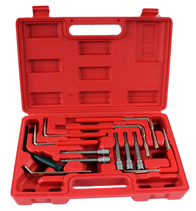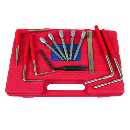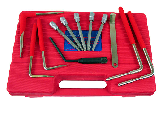 Zestaw specjalistycznych narzędzi używanych przy demontażu poduszek powietrznych marki FALON TECH. Przeznaczony dla serwisów motoryzacyjnych, przydatny przy wymianie poduszek powietrznych wielu modeli samochodów osobowych.