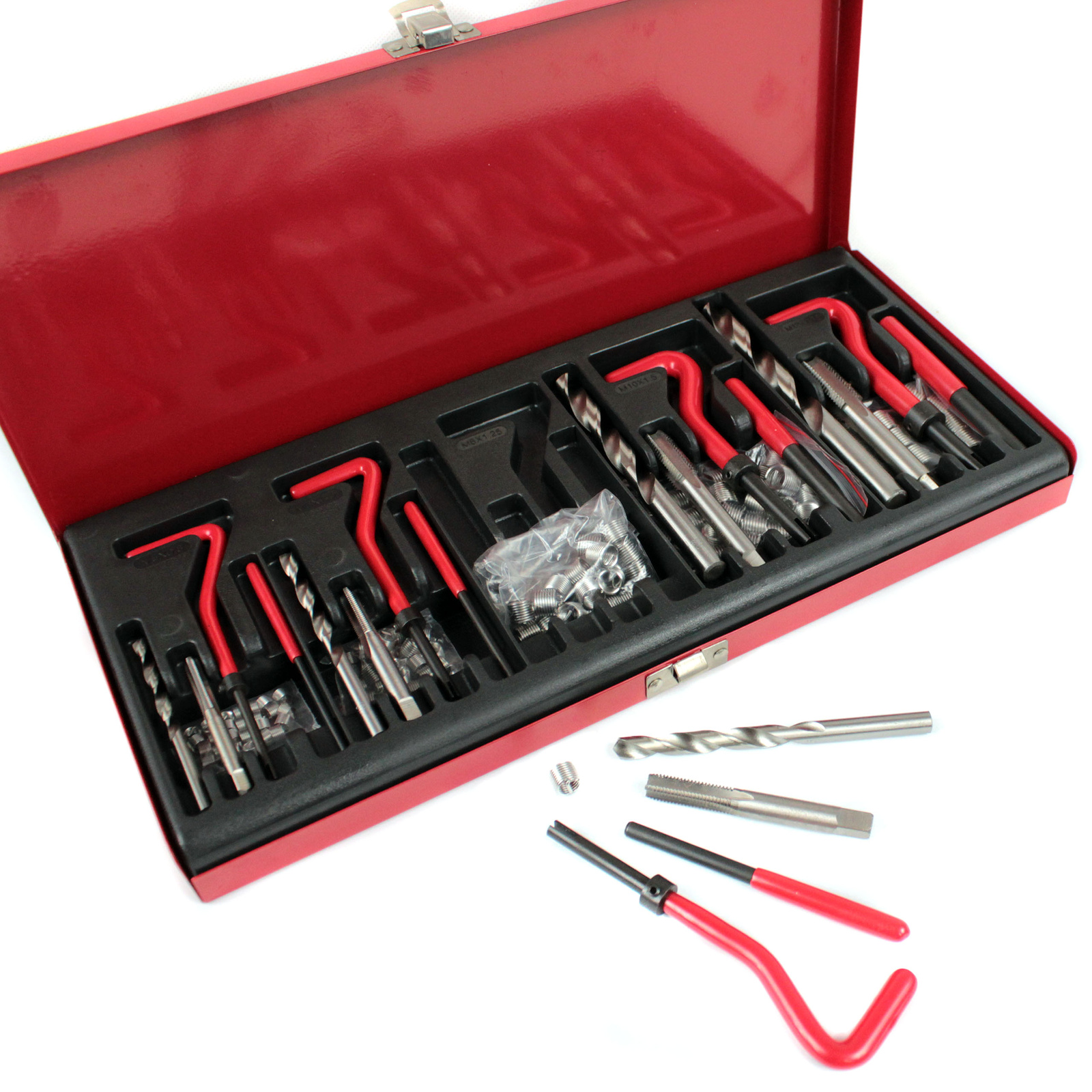 - Zestaw przeznaczony jest naprawy uszkodzonych gwintów w silnikach i innych elementach pojazdów. Wiertła i gwintowniki wykonane zostały ze stali szybkotnącej HSS4341.