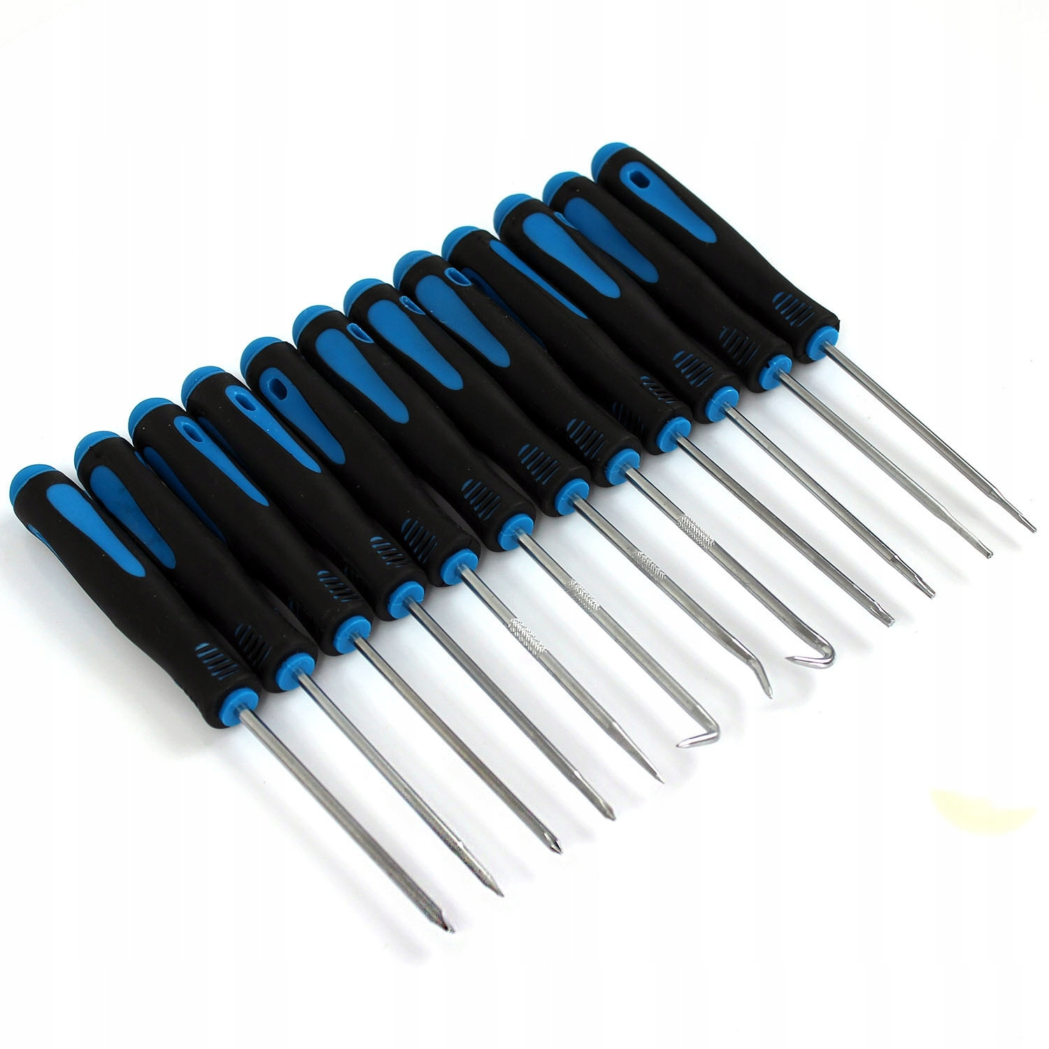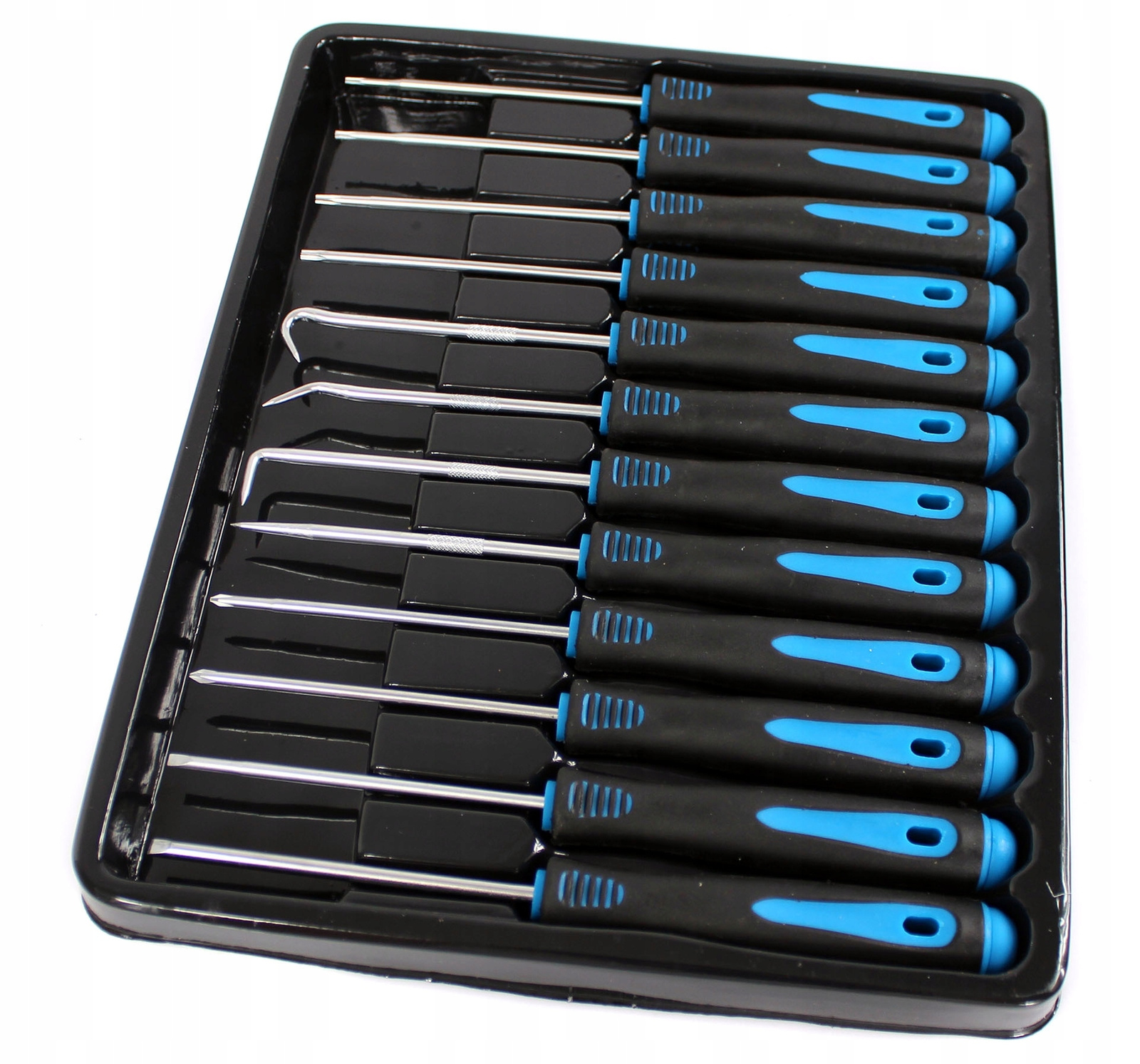 Zestaw zawiera haczyki idealne do podnoszenia się pierścieni zabezpieczających typu tłok, sworzeń drutu, zawleczki itd. oraz wkrętaki precyzyjne: płaskie, krzyżakowe i torx.