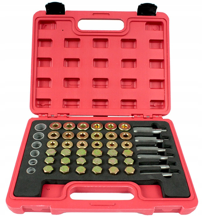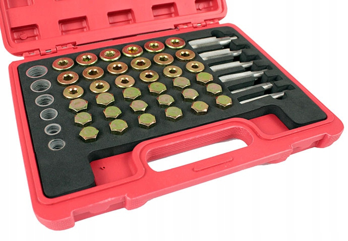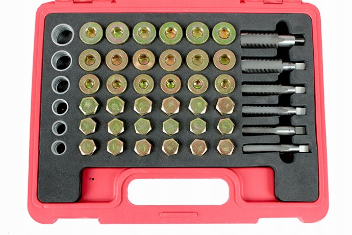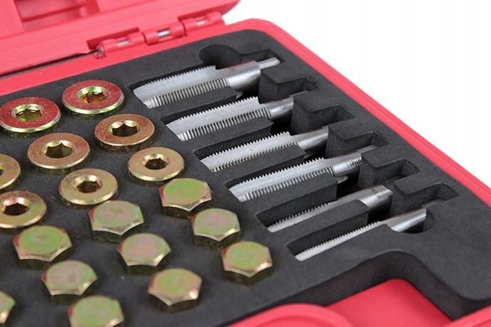 Zestaw do prostej naprawy gwintów korków spustowych miski olejowej, skrzyni biegów i innych.Pasuje do większości gwintów popularnie używanych w samochodach osobowych i lekkich samochodach ciężarowych. Zestaw przeznaczony do warsztatów samochodowych, naprawczych i serwisów. Całość zestawu umieszczona w mocnej, praktycznej walizce ułatwiającej transport i przechowywanie.