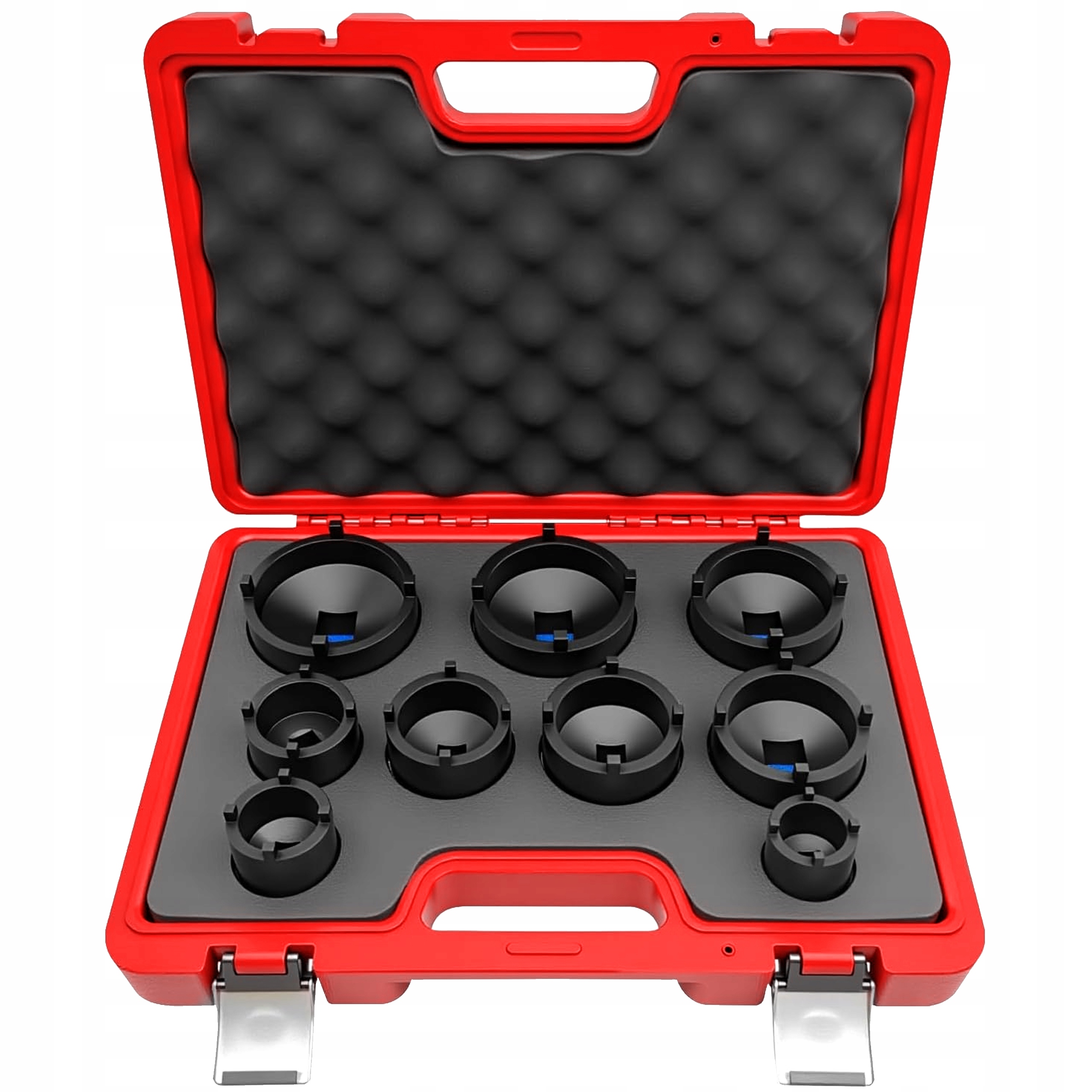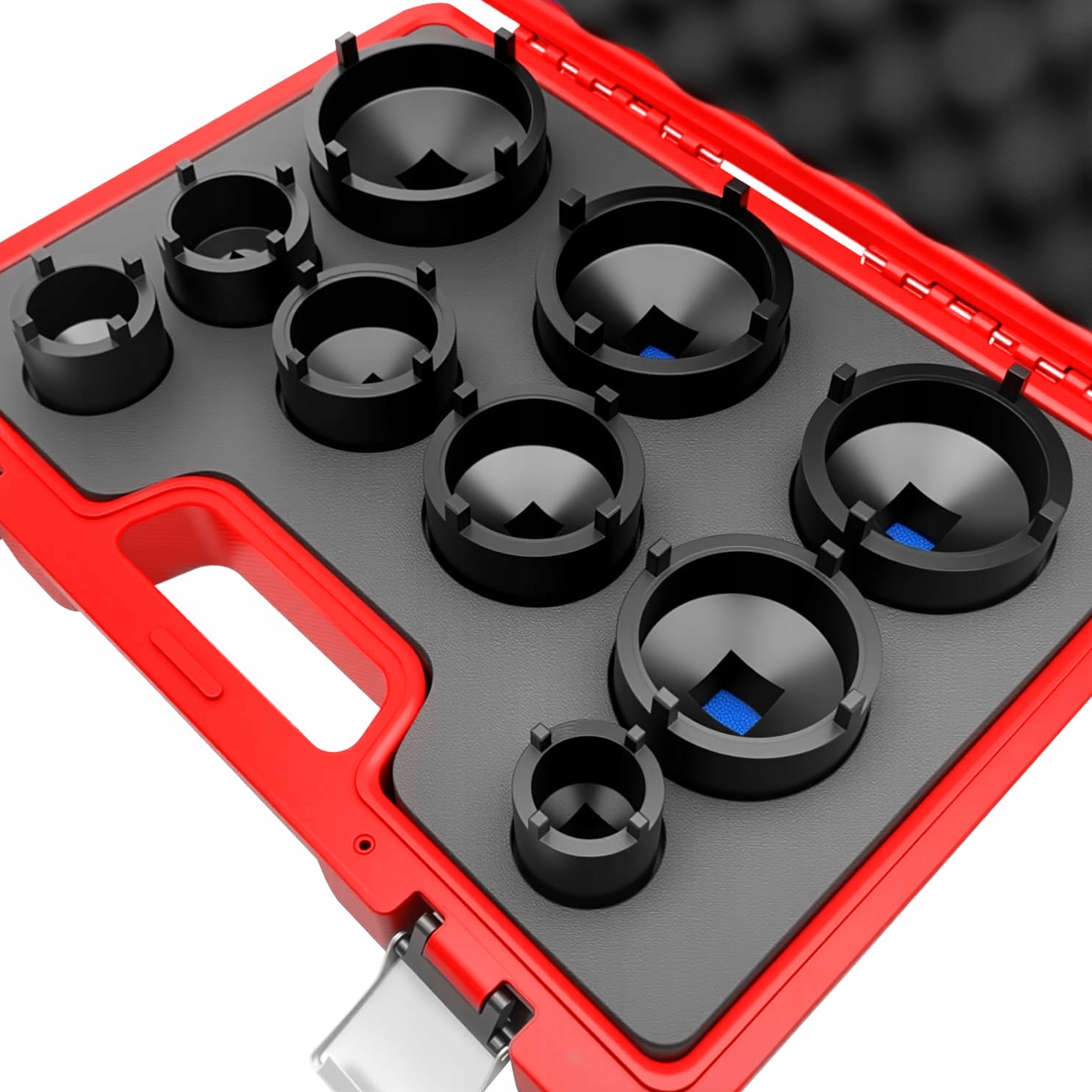 Profesjonalny zestaw 9 nasadek do nakrętek wieńcowych z 4 nacięciami – idealny do pracy przy piastach kół, skrzyniach biegów, mechanizmach różnicowych i maszynach przemysłowych. Wykonane z trwałej i odpornej na uszkodzenia stali narzędziowej Cr-V (chromowo-wanadowej), sprawdzą się zarówno w warsztacie, jak i w serwisie mobilnym.