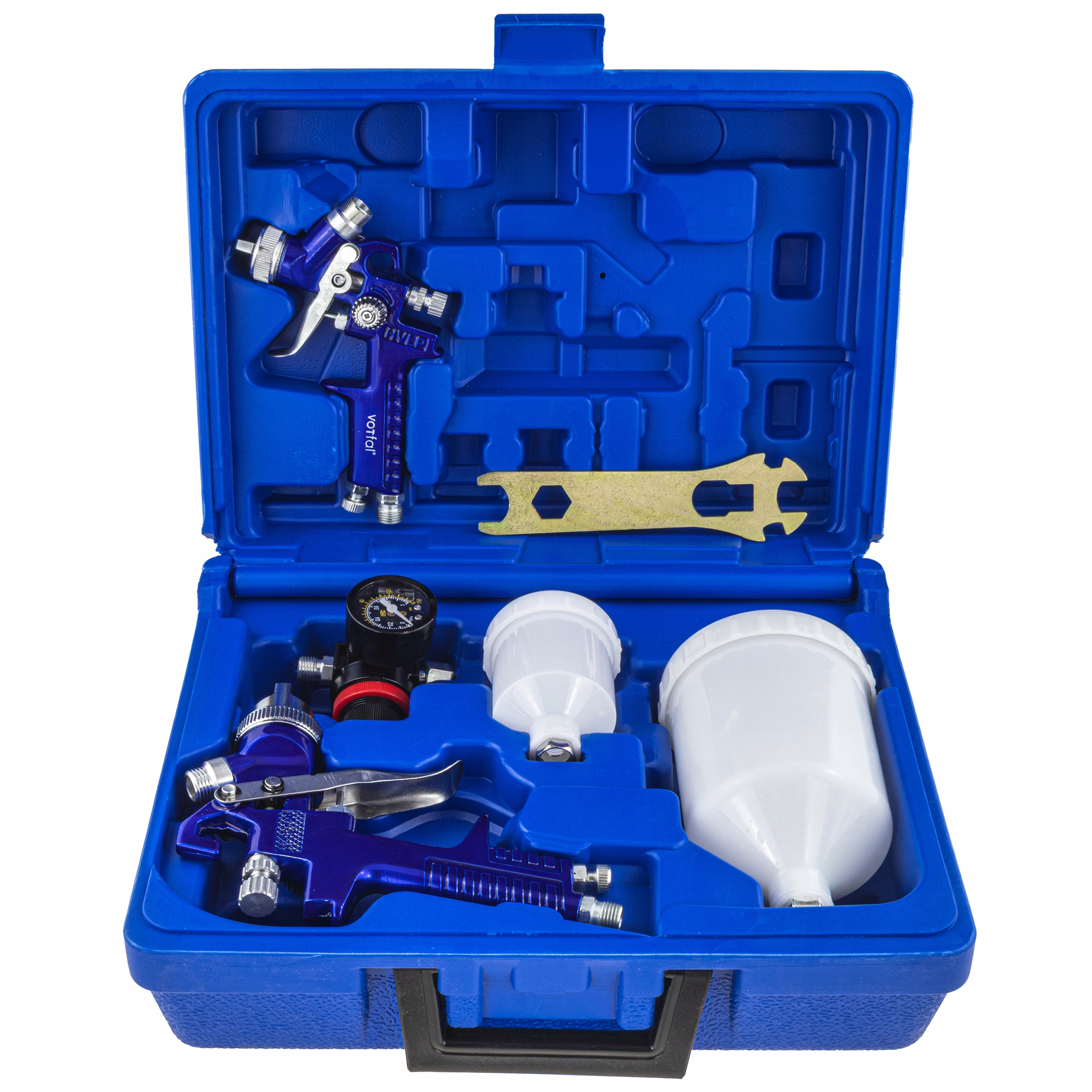 Profesjonalny zestaw 2 pistoletów lakierniczych HVLP w walizce z reduktorem ciśnienia – idealny wybór zarówno do warsztatu samochodowego, jak i do prac wykończeniowych w domu czy garażu.