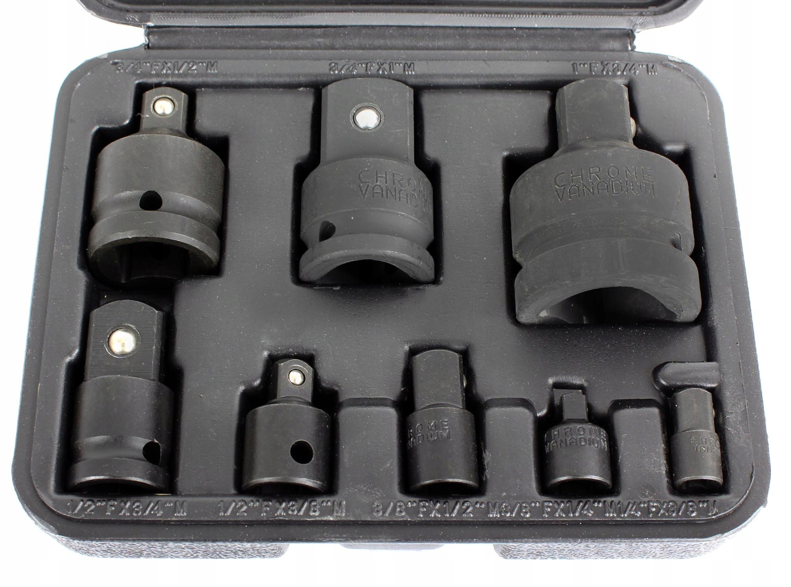 Komplet redukcji udarowych wykonanych ze stali Cr-V marki Silver. Nasadki wyposażone w kulkę blokującą.
