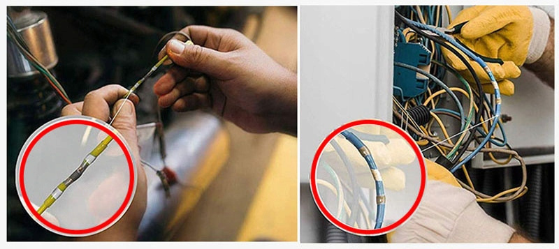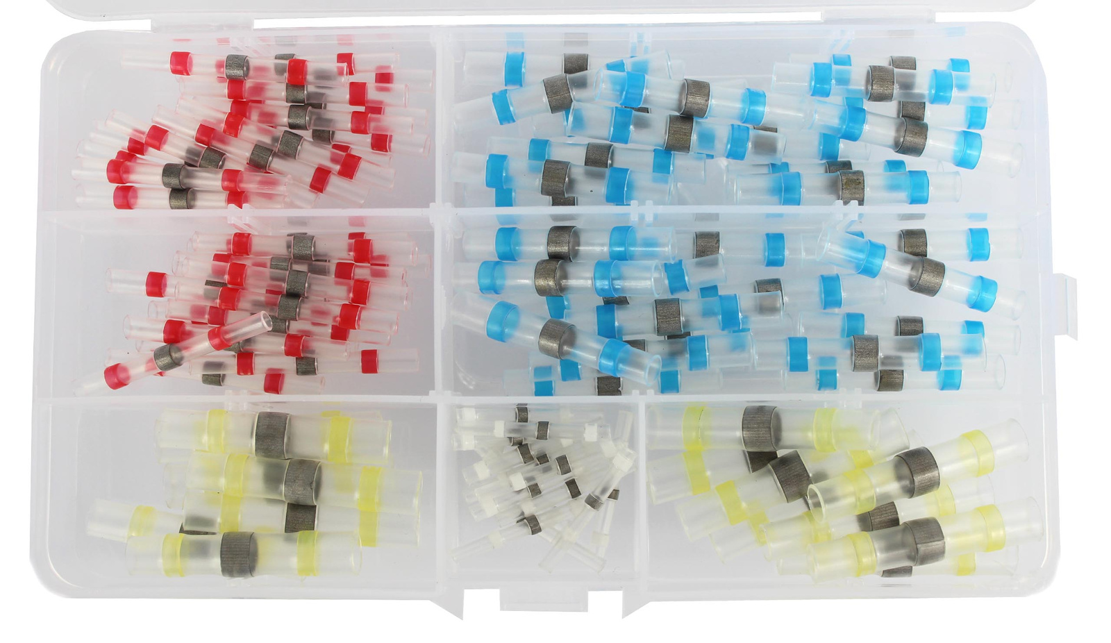 Zestaw szybkozłączek z cyną w rurce termokurczliwej do naprawy i łączenia przewodów. Złączki do kabli wykonane są z cyny lutowniczej, koszulki termokurczliwej oraz termoplastycznego kleju. Za trwałe połączenie żył odpowiada cyna, która roztapiając się łączy i zapewnia pewny styk żył. Klej termoplastyczny zapewnia szczelność i izolację połączenia. Całość połączenia w tego rodzaju złączce kablowej dokonuje się w tym samym czasie, przezroczysta rurka termokurczliwa umożliwia stałą kontrolę podczas procesu łączenia żył.