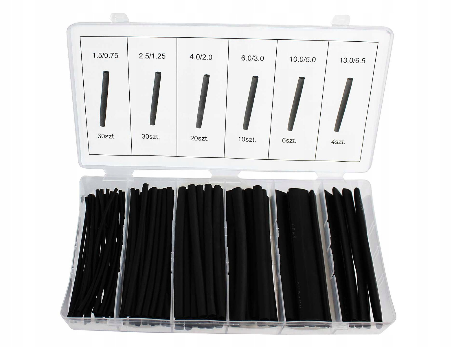 Zestaw wysokiej jakości rurek termokurczliwych. W skład zestawu wchodzi 100 sztuk rurek termokurczliwych w 6 popularnych rozmiarach. Koszulki chronią przewody przed wilgocią i korozją.