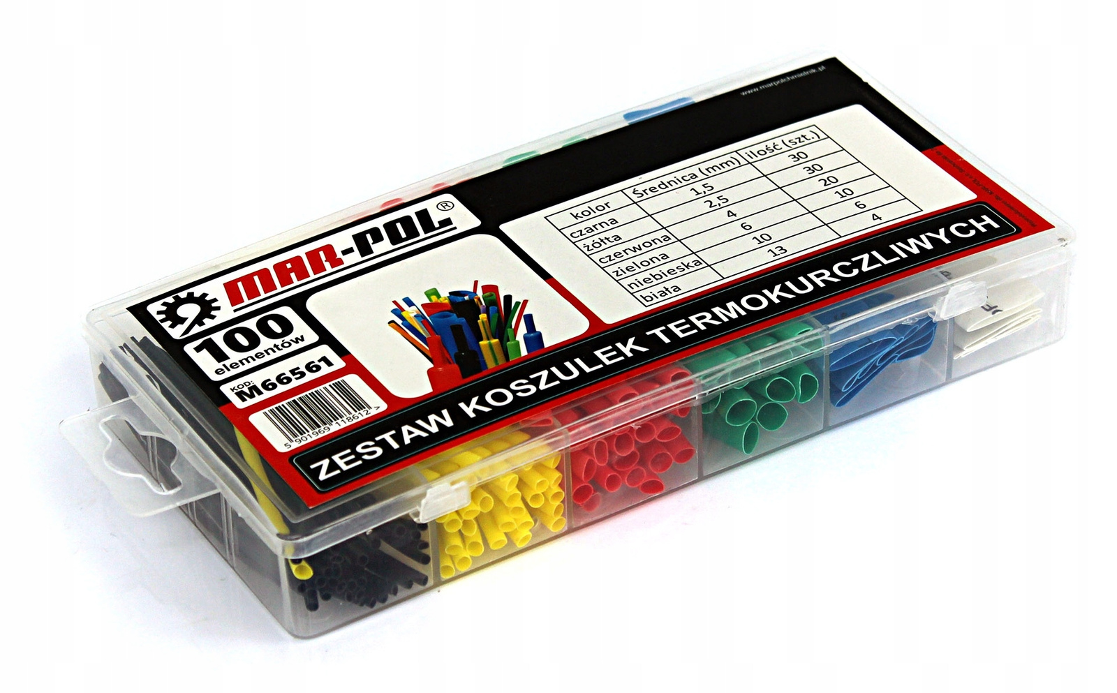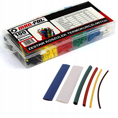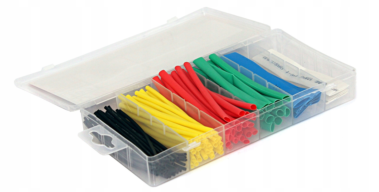 Zestaw wysokiej jakości rurek termokurczliwych. W skład zestawu wchodzi 100 sztuk rurek termokurczliwych w 6 popularnych rozmiarach. Koszulki chronią przewody przed wilgocią i korozją.