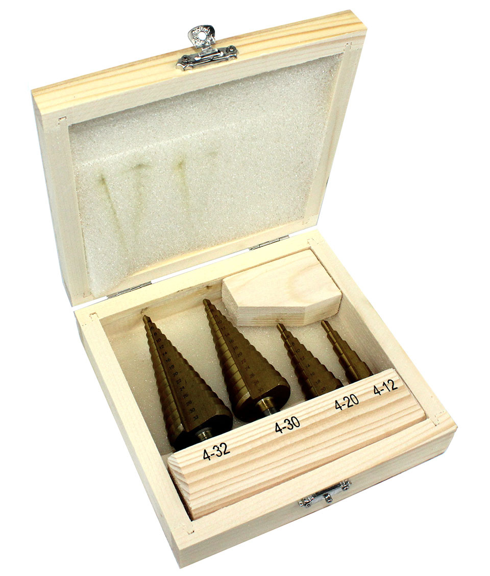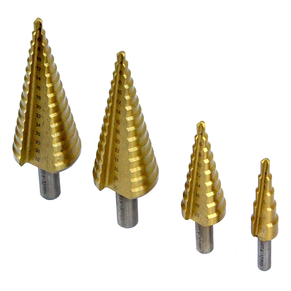 KOMPLET 4 WIERTEŁ STOPNIOWANYCH 4-12mm 4-20mm 4-30mm 4-32mm