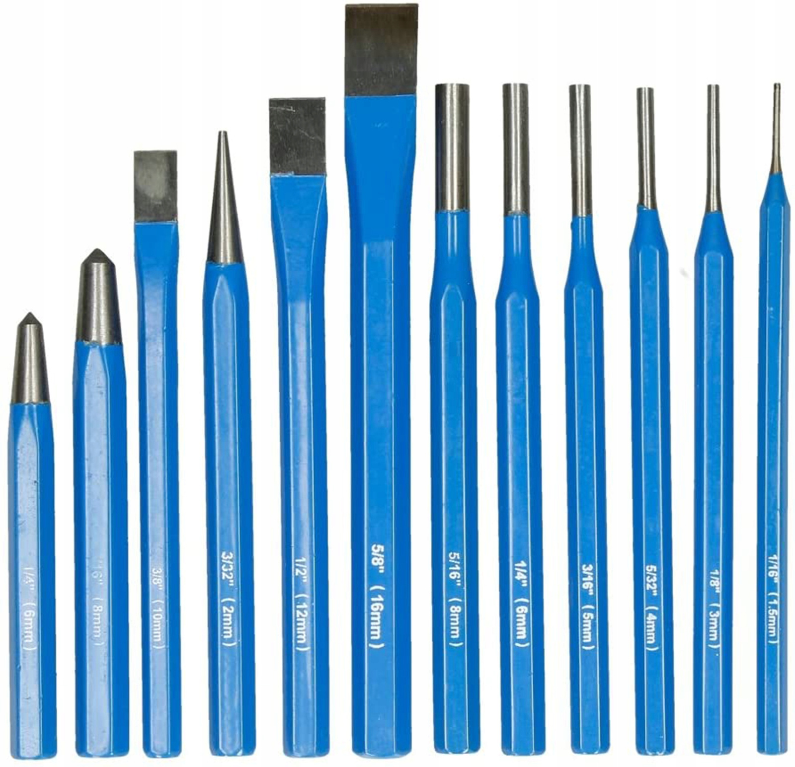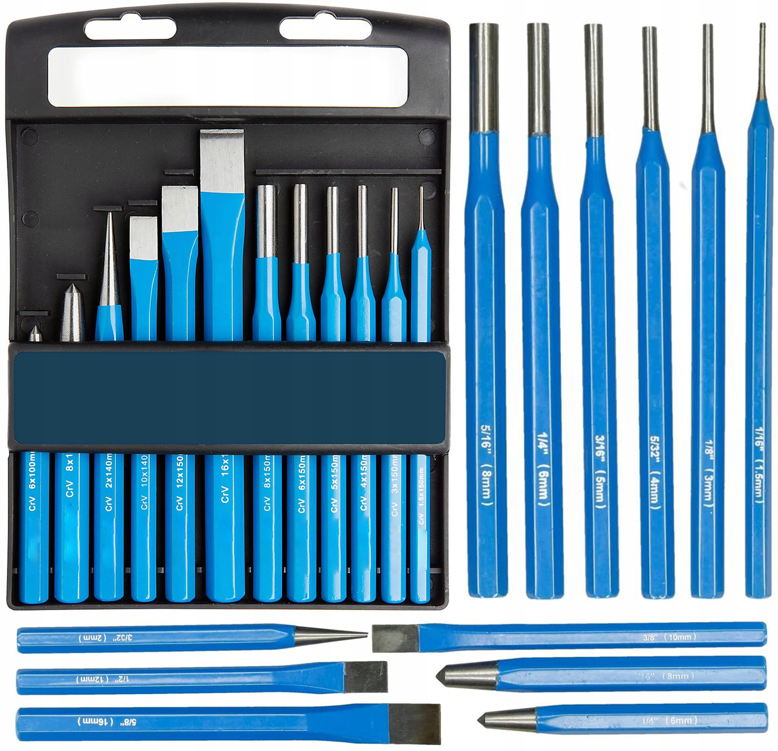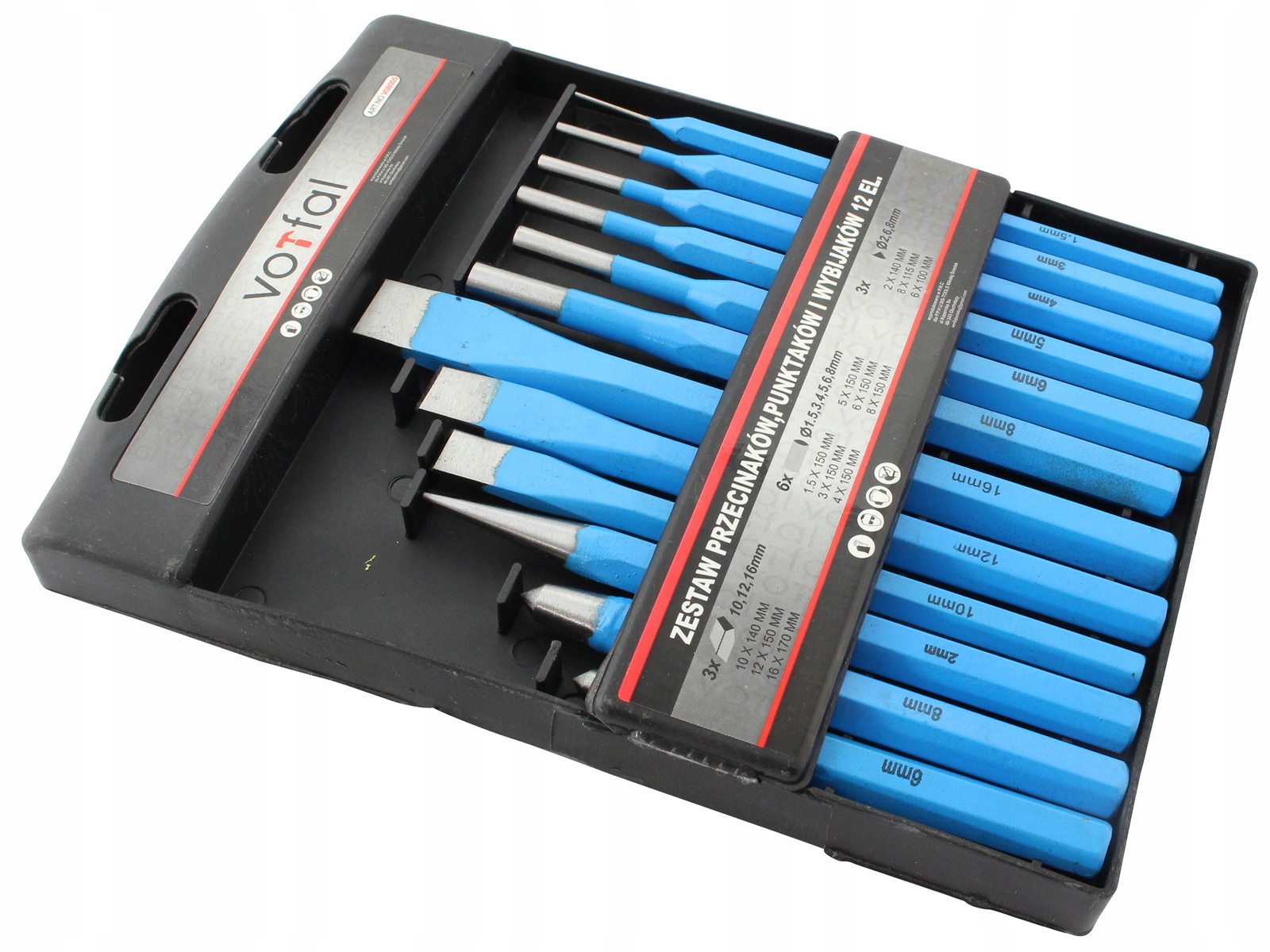 Zestaw przecinaków, wybijaków i punktaków. Zestaw w całości wykonany został z wysoce wytrzymałej stali chromowo-wanadowej (CrV). Znajdą zastosowanie w pracach ślusarskich i mechanicznych. Zestaw będzie przydatny do zaznaczania środka otworów przed wierceniem, do cięcia blachy i prętów oraz wybijania elementów metalowych.